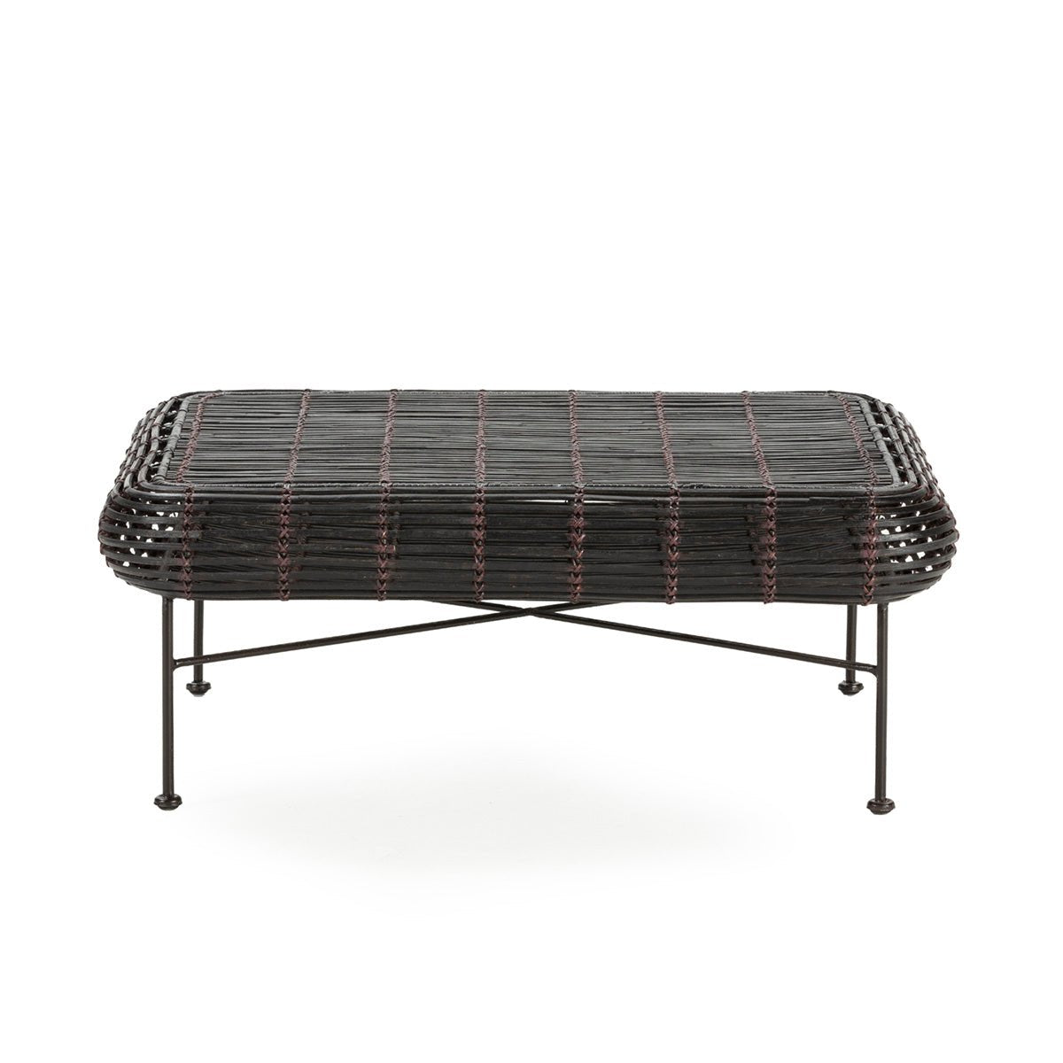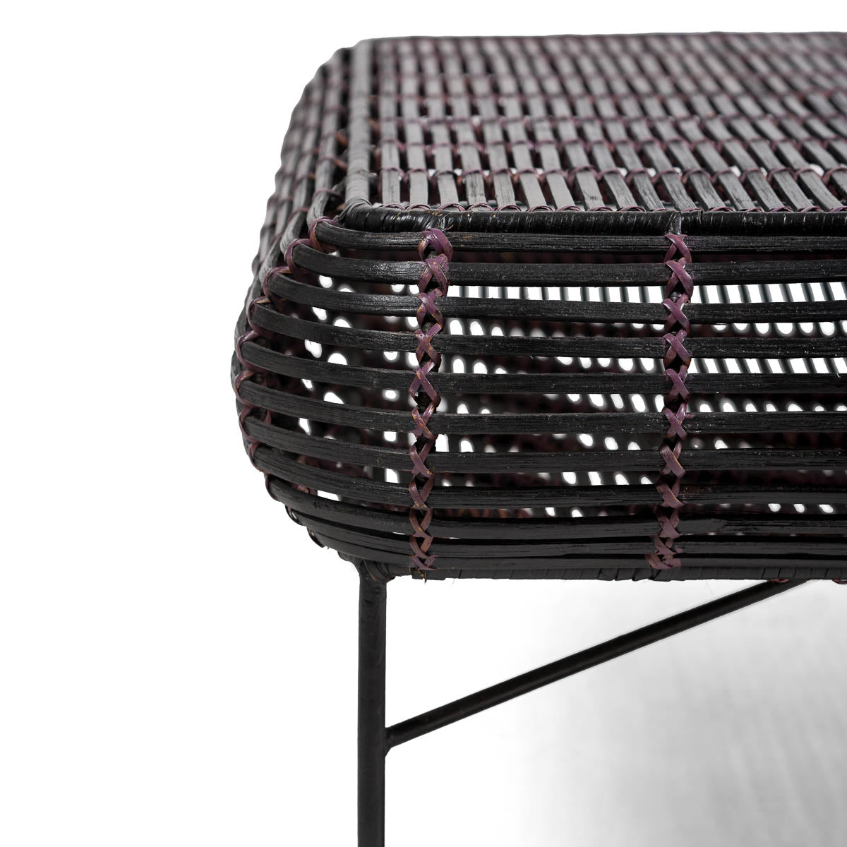 Preciosa mesa de centro fabricada en metal color negro y tapa en mimbre negro con detalles en violeta.