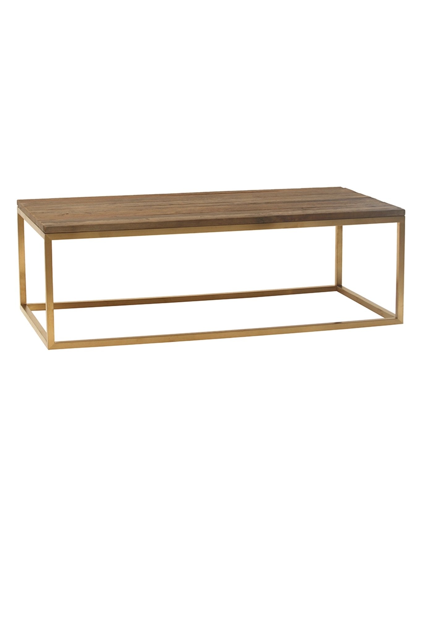 Preciosa mesa de centro fabricada en madera de olmo en color natural y estructura en latón dorado mate.