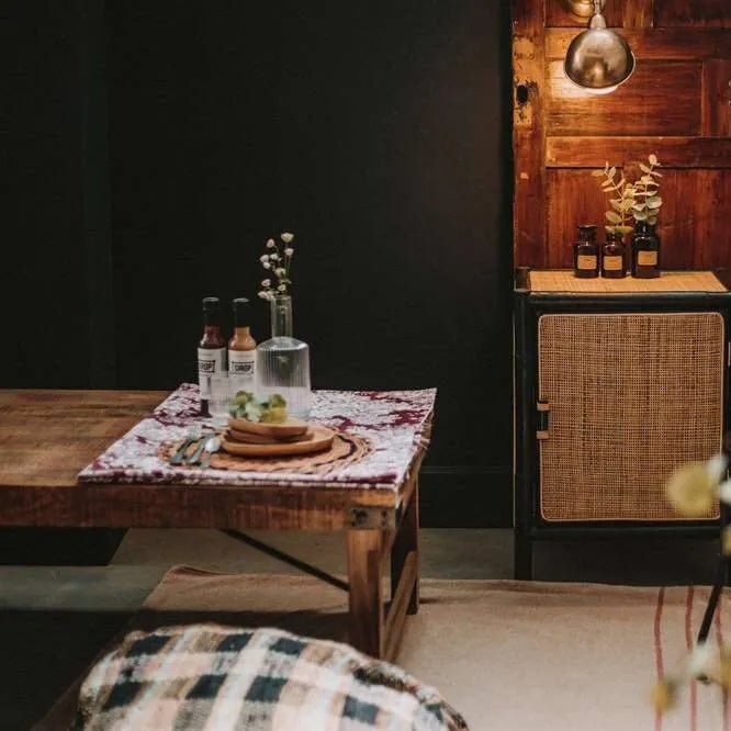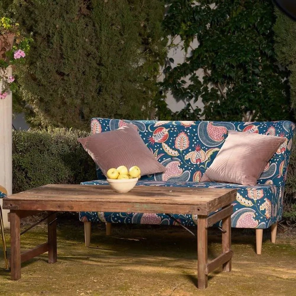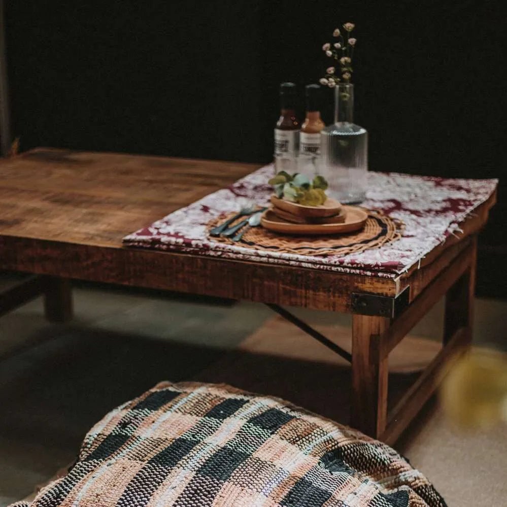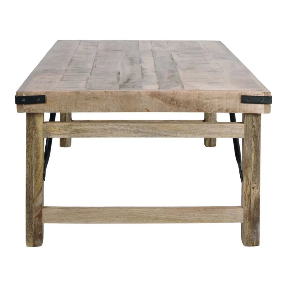 Mesa de centro baja de estilo industrial - vintage. Está fabricada íntegramente en madera tropical envejecida de color natural. Es plegable, y no requiere montaje.