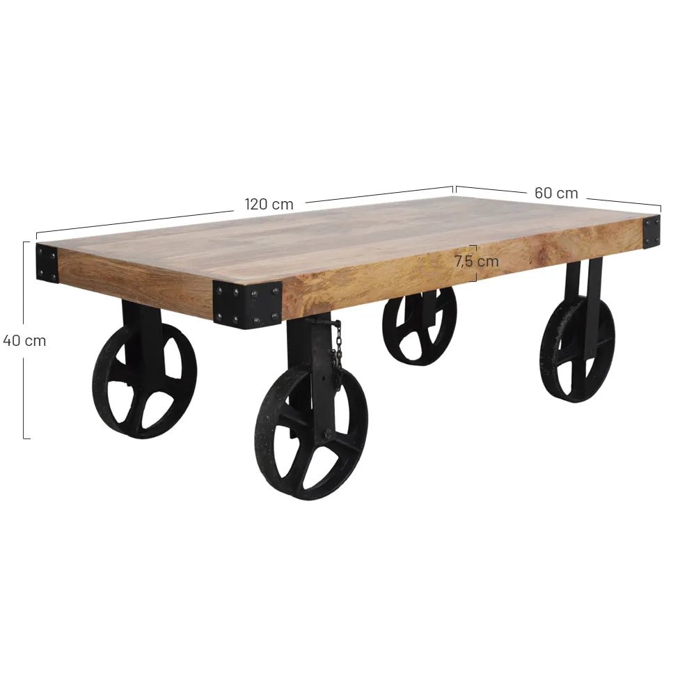 Mesa de centro baja de estilo industrial. Está fabricada en madera envejecida color natural, con ruedas de hierro forjado negras. No requiere montaje.