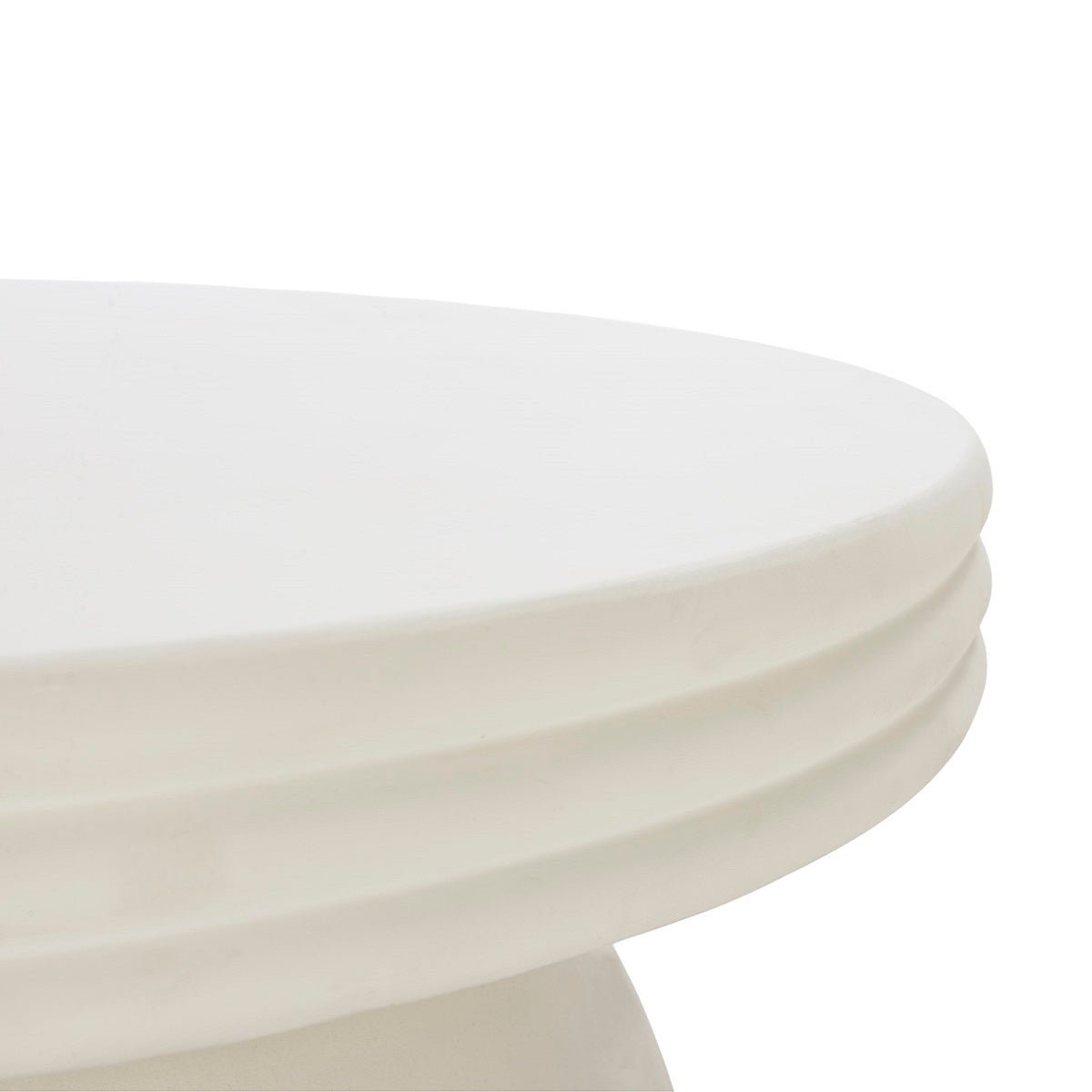 Preciosa mesa de centro redonda fabricada con mezcla de cementos y piedras de lava en polvo color blanco.
