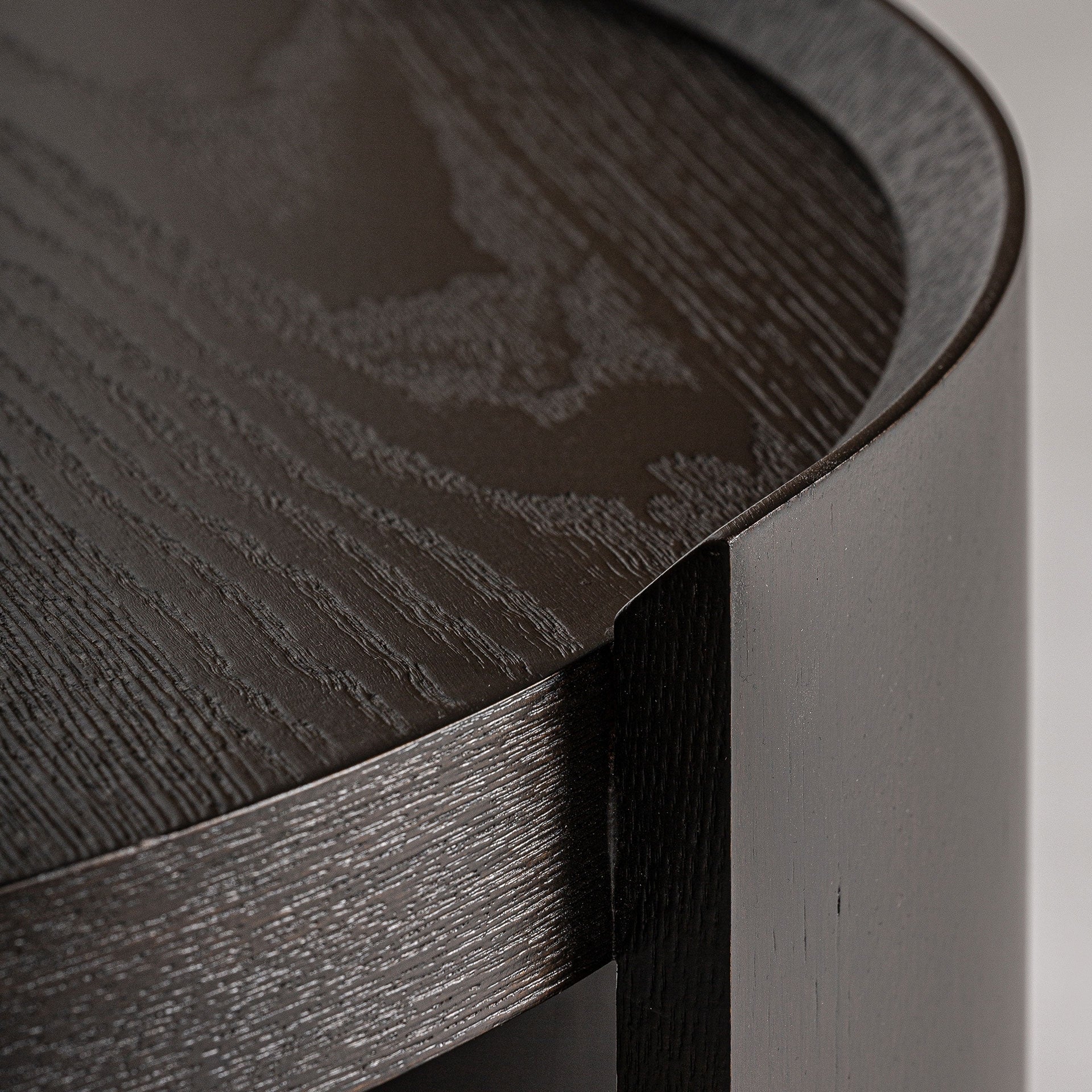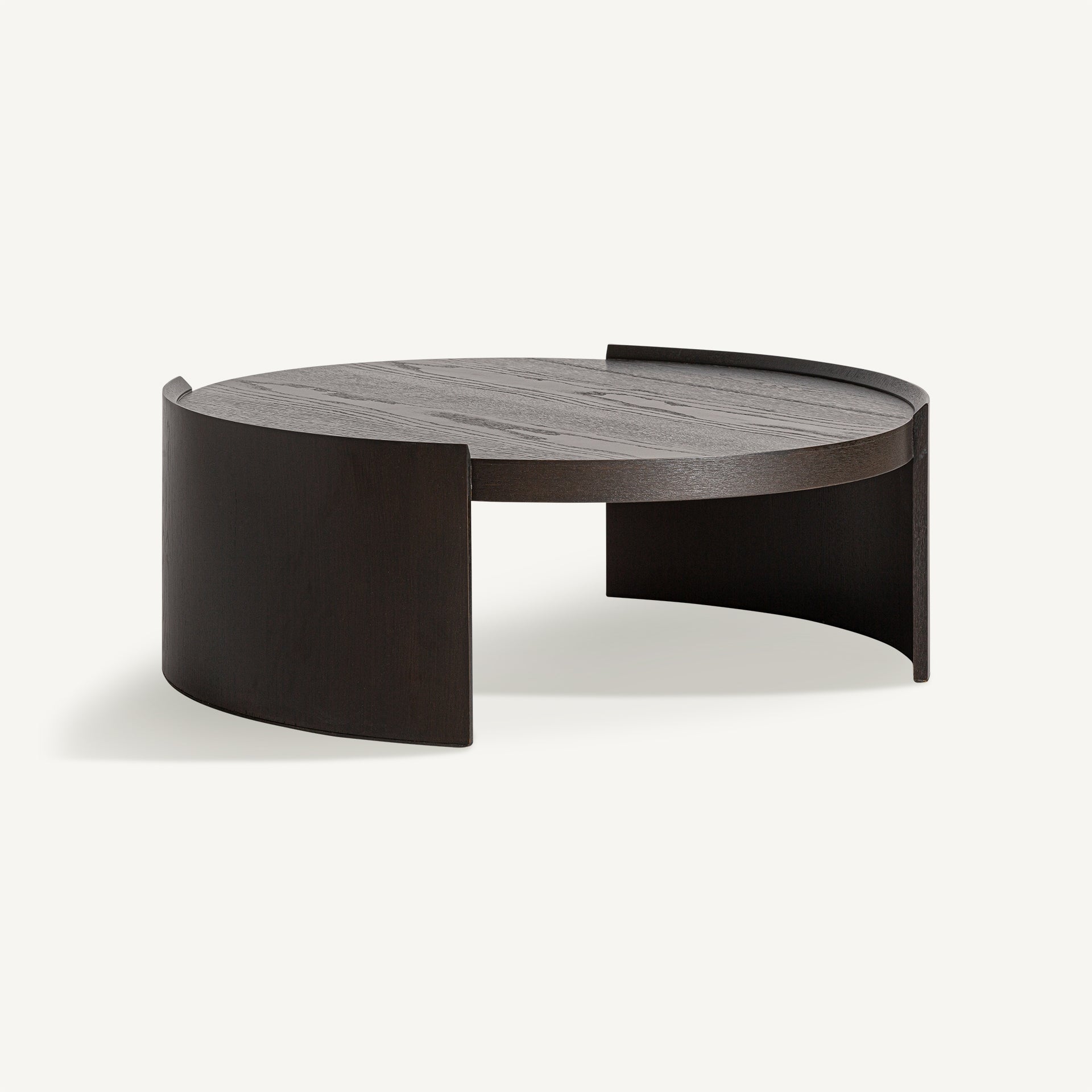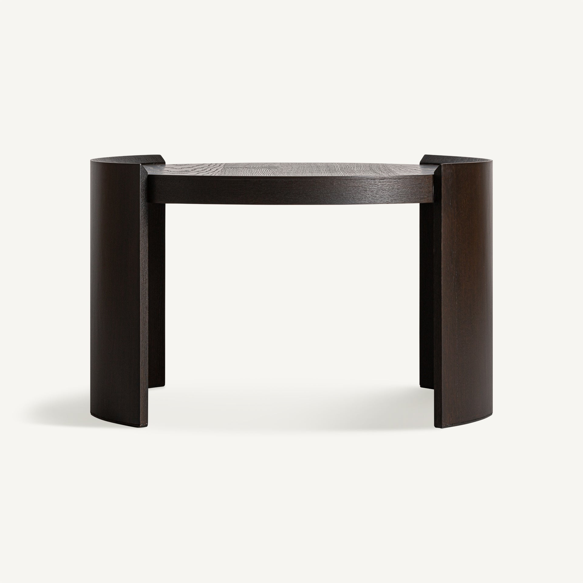 Mesa de centro fabricada de forma artesanal en madera de roble de color marrón, de estilo art deco.