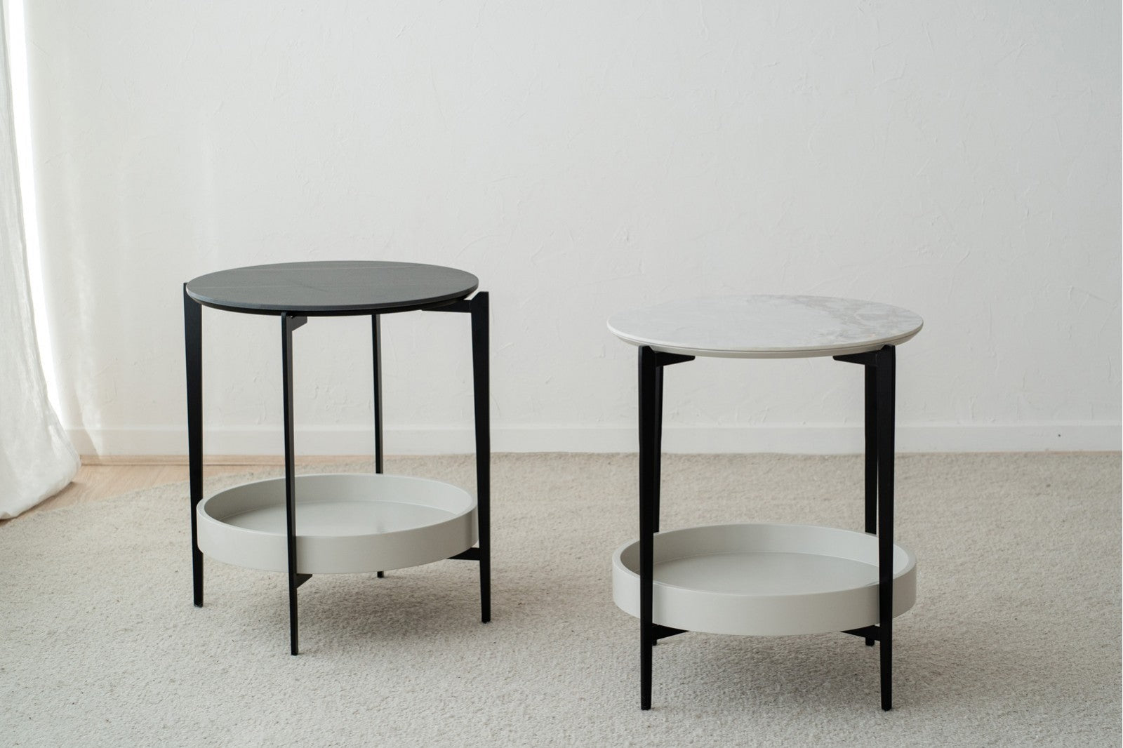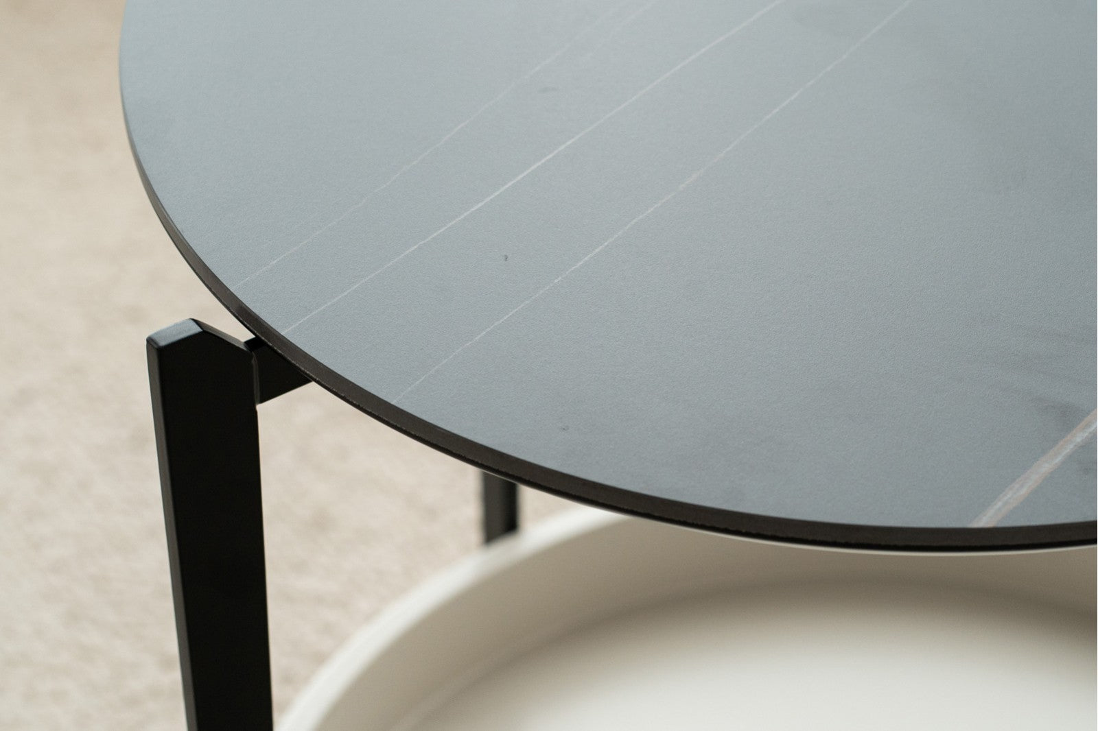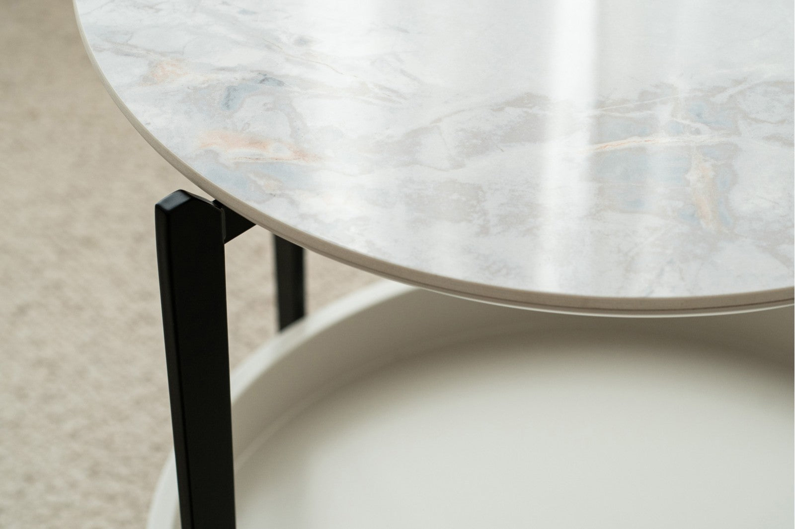 Mesa auxiliar redonda con pata en metal negro mate y sobre en mármol cerámico brillo en tonos blanco y grises o negro mate con vetas en ocre con bandeja inferior tablero lacado en color mate gris arena.