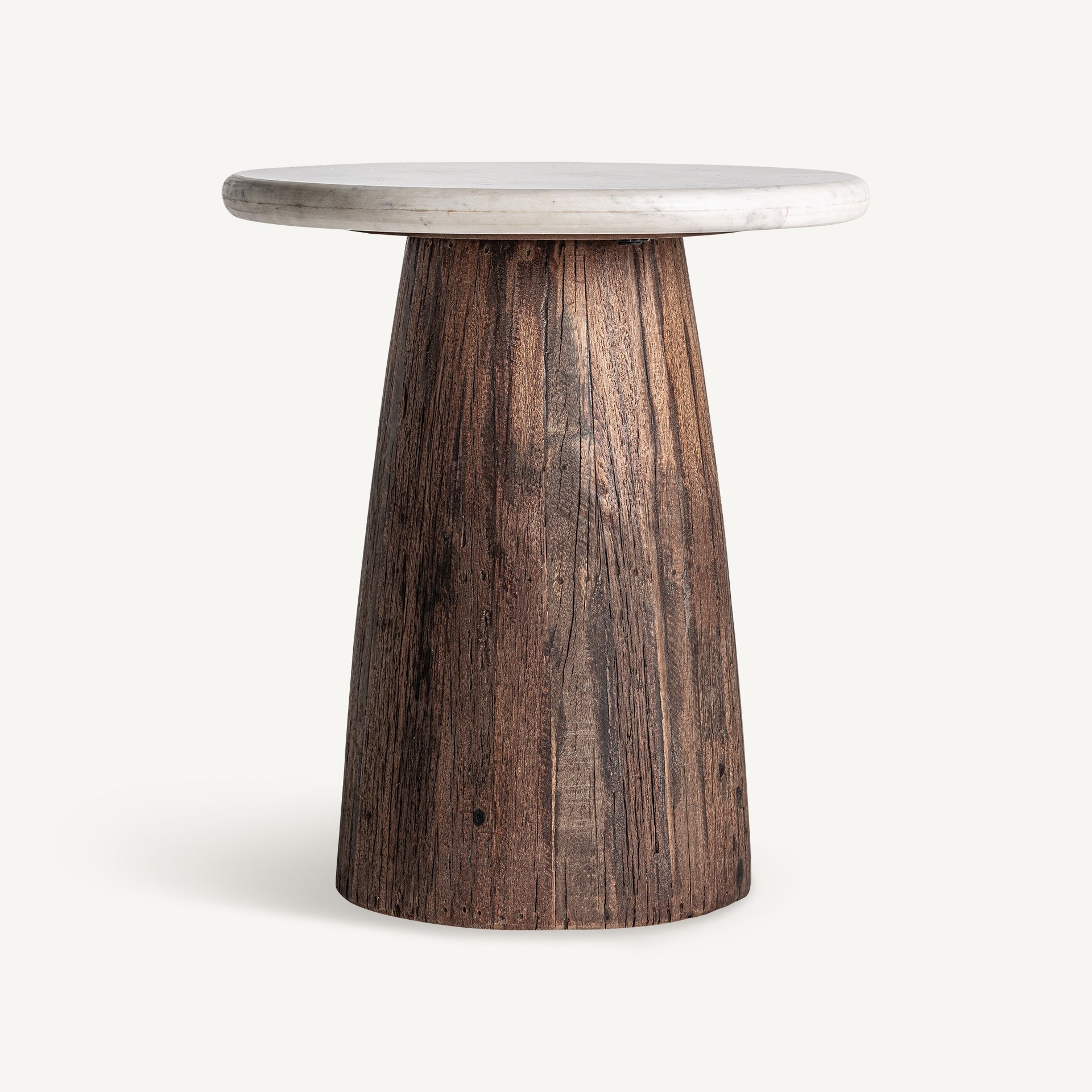Preciosa mesa auxiliar de estilo rústico, fabricado en madera recuperada en color marrón con acabado envejecido, combinado con mármol en color blanco.
