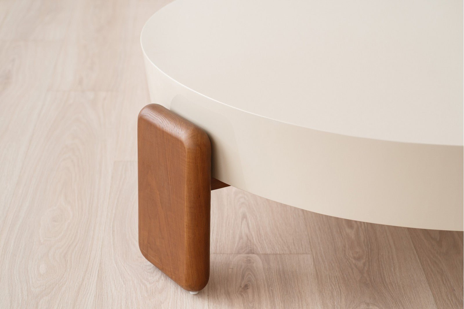 De forma redonda y un metro de diámetro, presenta una pieza central cónica lacada en color beige alto brillo, que aporta luminosidad y sofisticación. Esta estructura se eleva ligeramente del suelo gracias a tres piezas de base en madera maciza de nogal con bordes redondeados, generando una sensación de ligereza y flotación.
