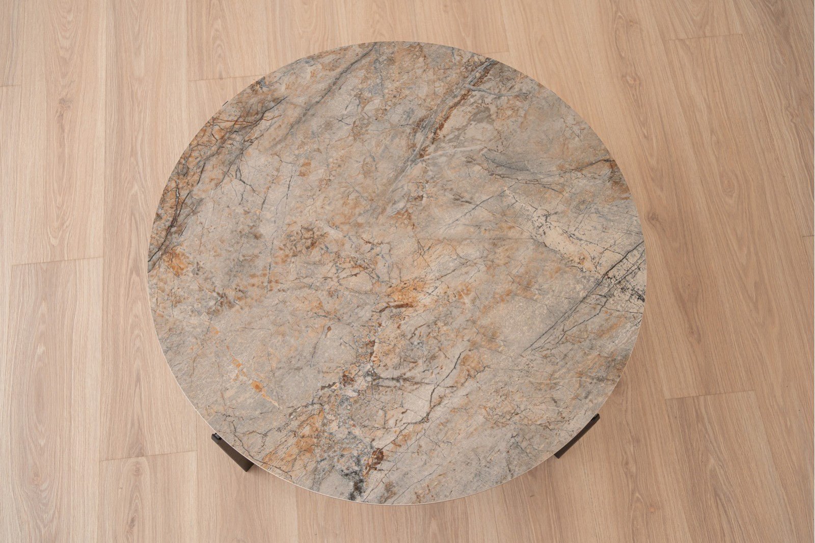 Su sobre redondo de cerámica en acabado brillo tipo mármol, con tonos piedra, grises y ocres, aporta un toque natural y sofisticado que realza cualquier ambiente. La estructura en metal negro mate, de líneas definidas y depuradas, ofrece un contraste actual y equilibrado, garantizando resistencia y estabilidad.