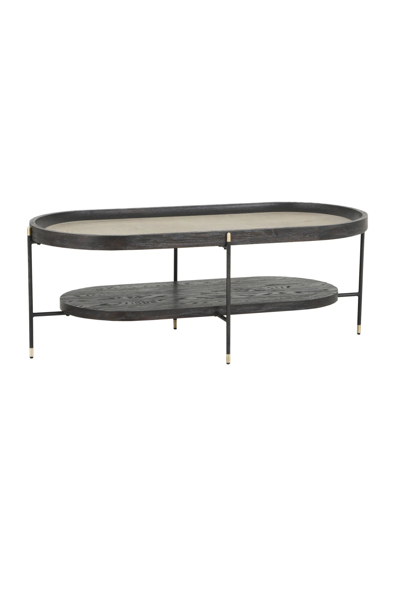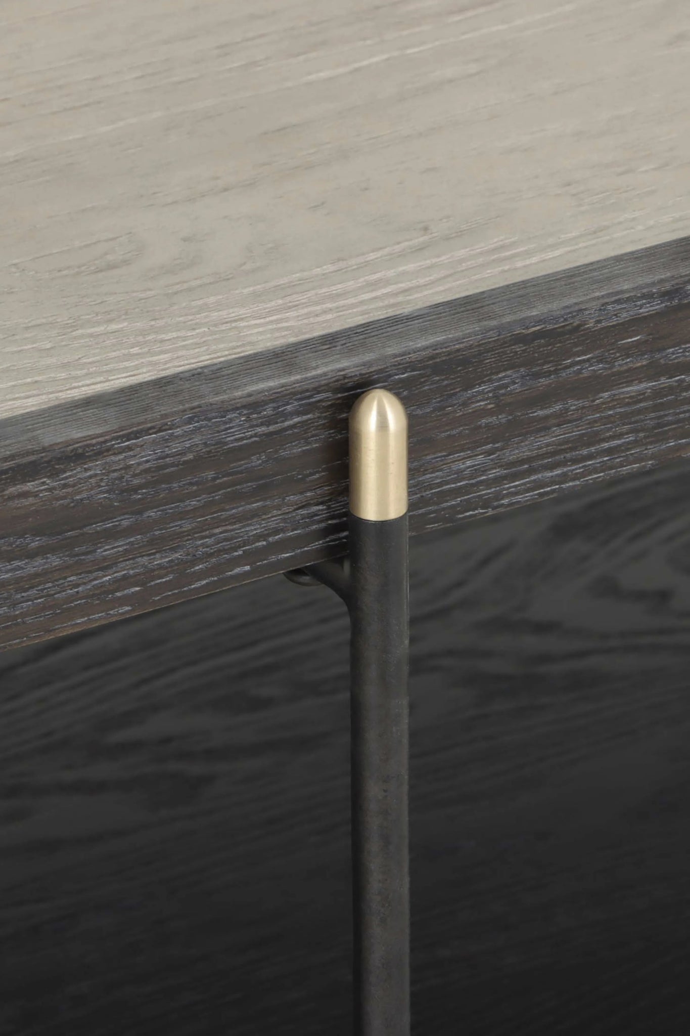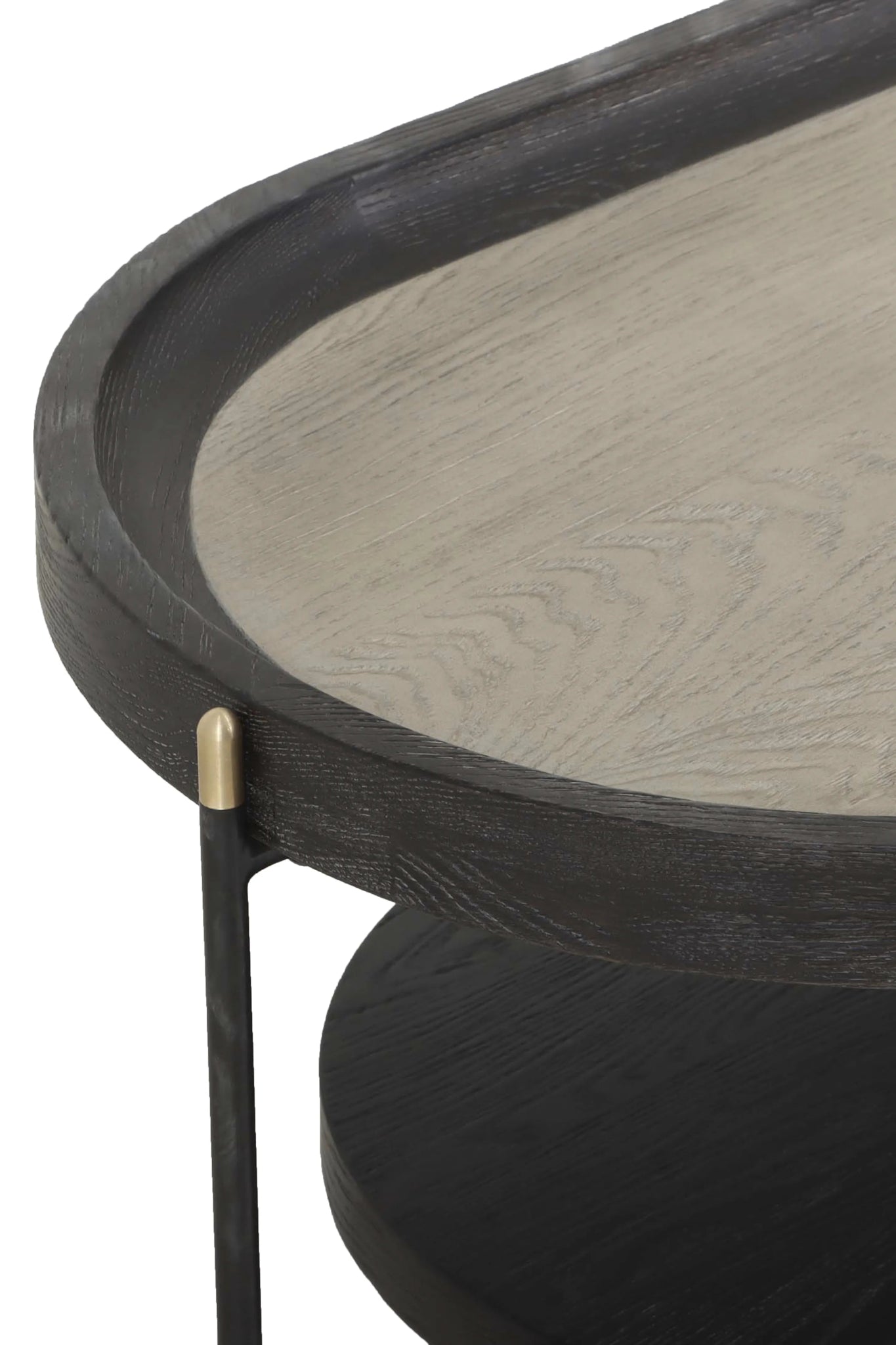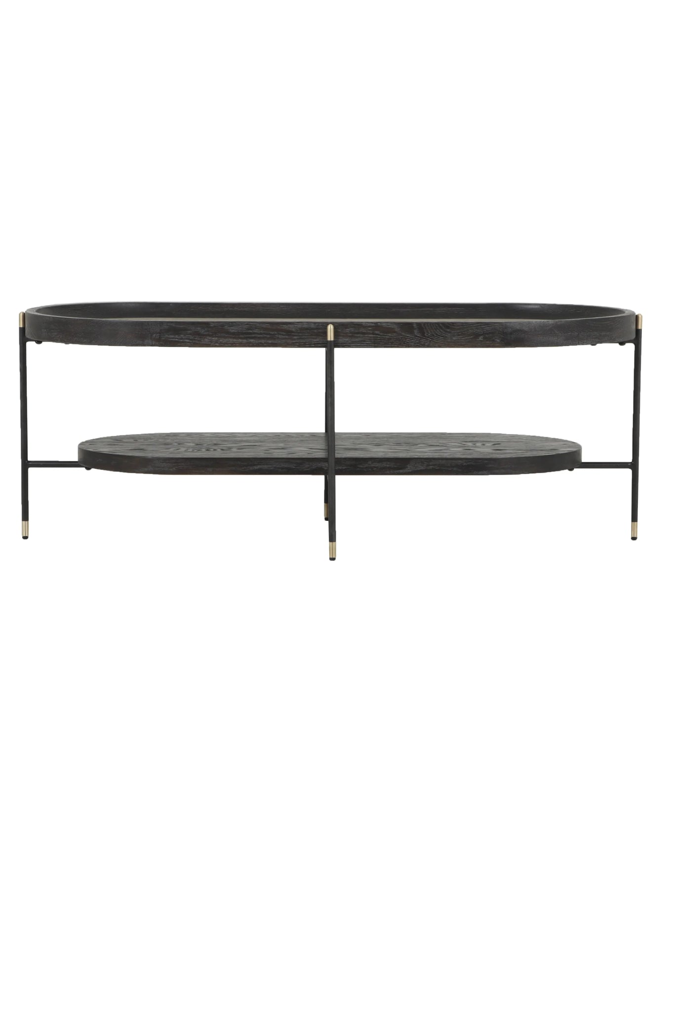 Mesa de centro fabricada en madera de roble en color negro, acompañada de patas de hierro en el mismo tono con delicados detalles en dorado que realzan su elegancia. Su diseño combina robustez y sofisticación, creando una pieza de estilo contemporáneo y atemporal, ideal para salones modernos que buscan distinción y carácter.