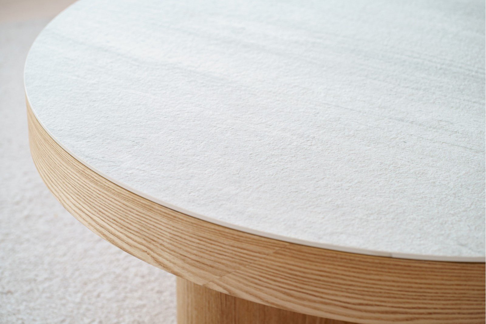 Mesa de centro Giulio, redonda sobre cerámico de 6mm de espesor en tonos gris blanco con una textura rugosa. En su diseño destaca su pié central de formas curvas realizado en MDF con chapa de fresno natural