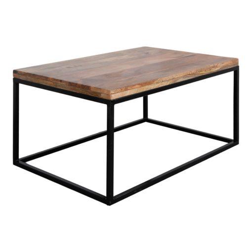 Mesa de centro rectangular de estilo industrial. Cuenta con una estructura tubular de acero acabada en pintura en polvo y tapa de madera tropical en color natural. No requiere montaje.