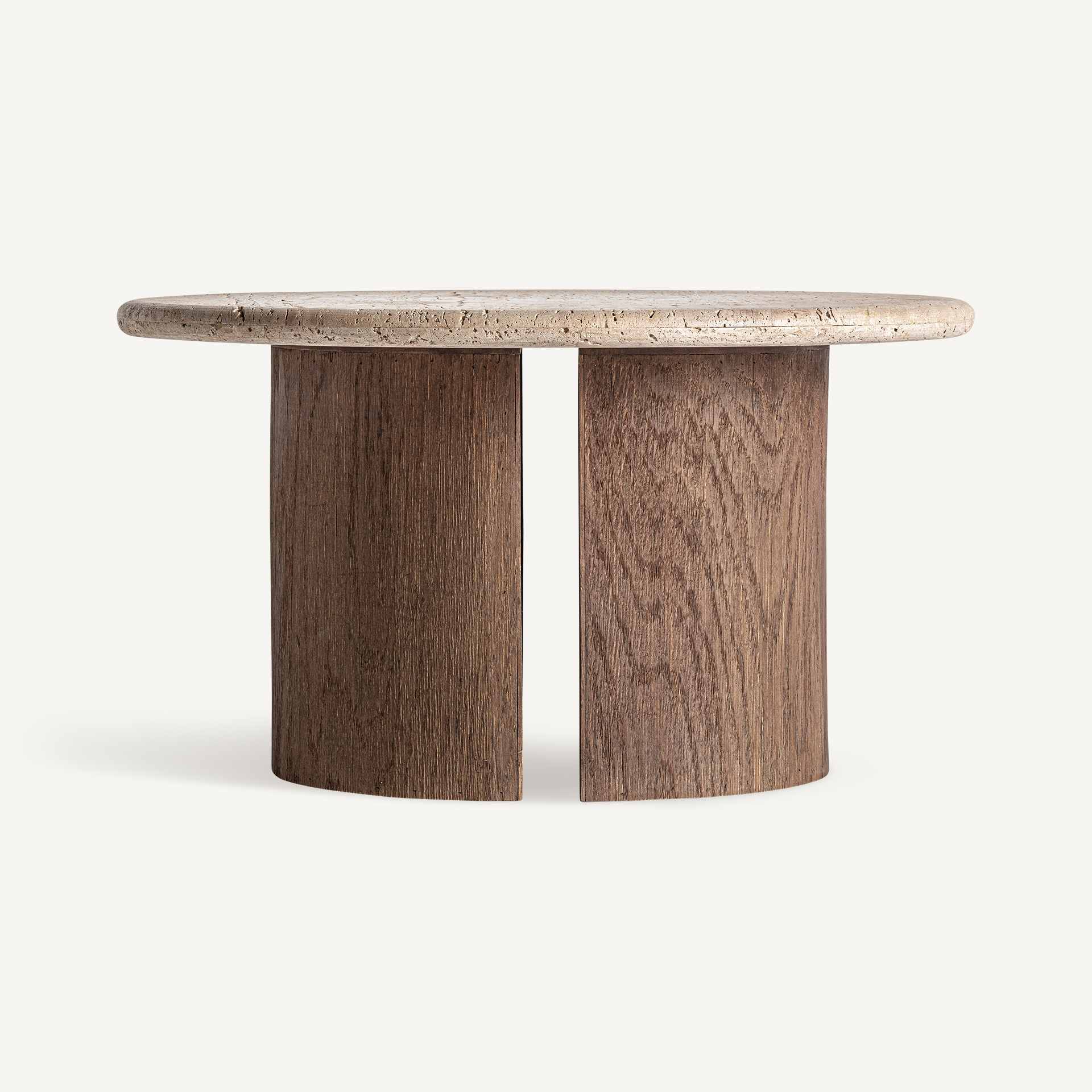 La mesa Ming destaca por su imponente sencillez y el equilibrio perfecto entre materiales naturales. Su estructura en madera recuperada de tono marrón envejecido aporta carácter y autenticidad, mientras que la superficie en travertino crema brinda una textura suave y luminosa.