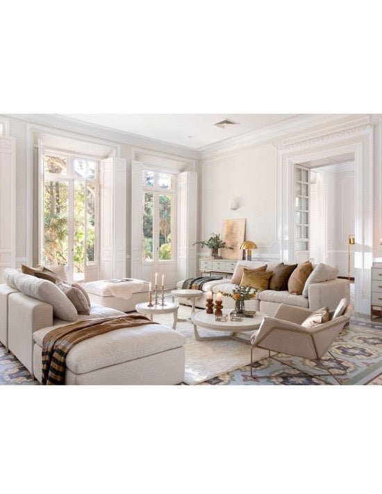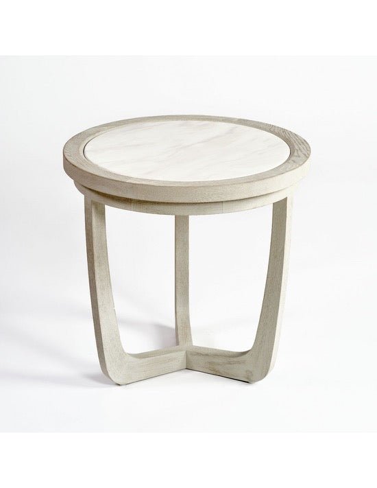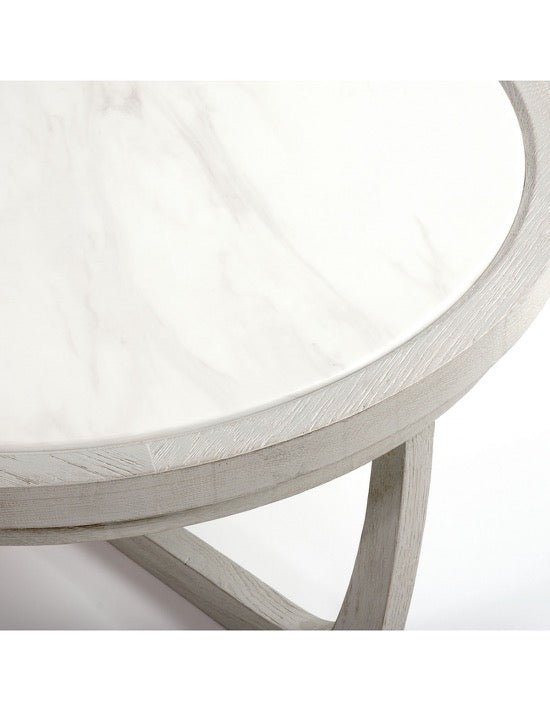 Mesa de centro redonda de madera de roble acabado blanco grisáceo y sobre de piedra blanco. Este modelo cuenta con 3 patas combinable con otras medidas para formar set. El color dependerá de la luz natural de la habitación. Toma un color más gris en zonas más oscuras y más blanco en zonas más luminosas. Disponible en diferentes medidas.