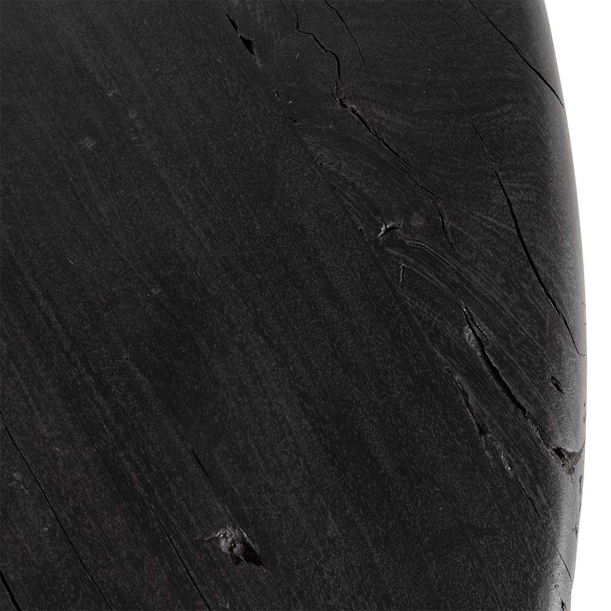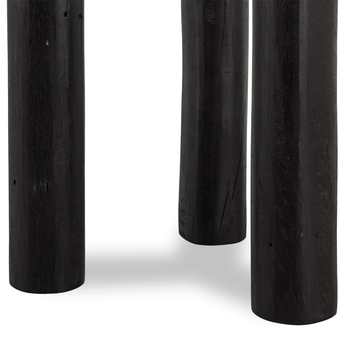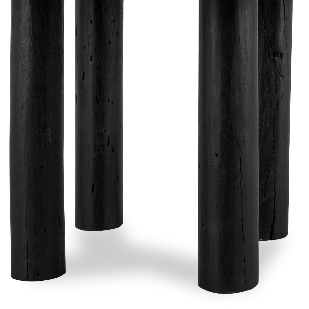 El tono negro de su superficie añade un toque de sofisticación y modernidad, creando un contraste perfecto con las texturas naturales de la madera. Su original estructura de tres o cuatro patas cilíndricas no solo ofrece una base sólida y equilibrada, sino que también aporta un elemento distintivo que la convierte en el centro visual de cualquier estancia.