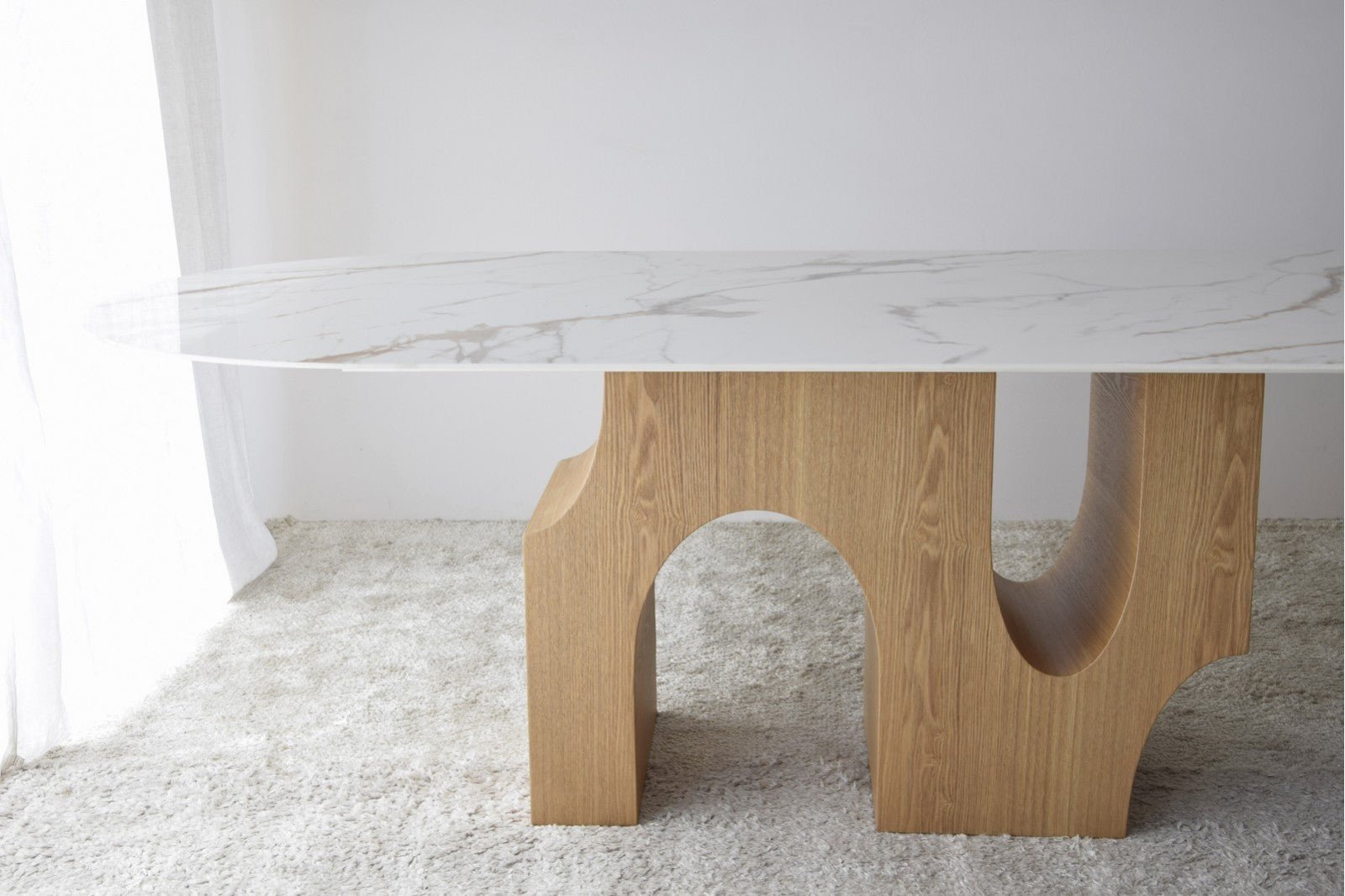 Mesa de comedor fabricado en material cerámico de 12 mm de espesor con acabado en mármol y la base realizada en DM rechapado de en madera de fresno natural y negro. Disponible en varios colores.