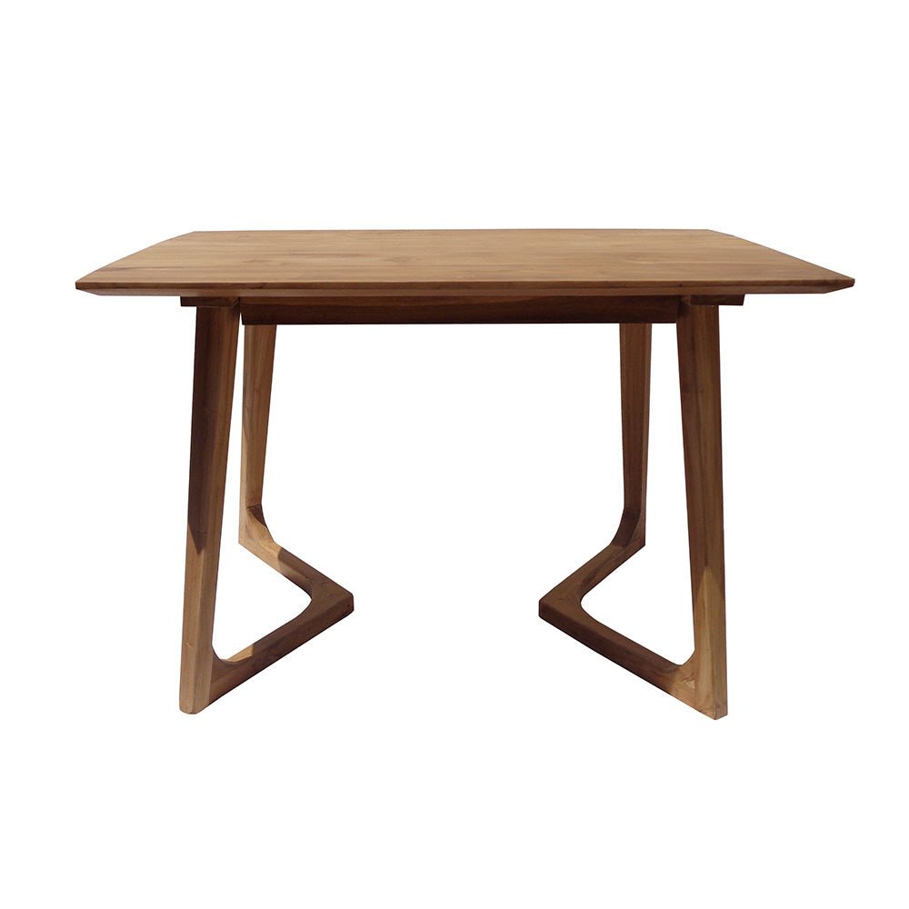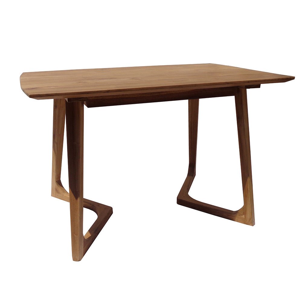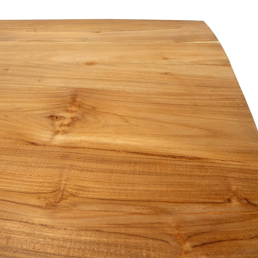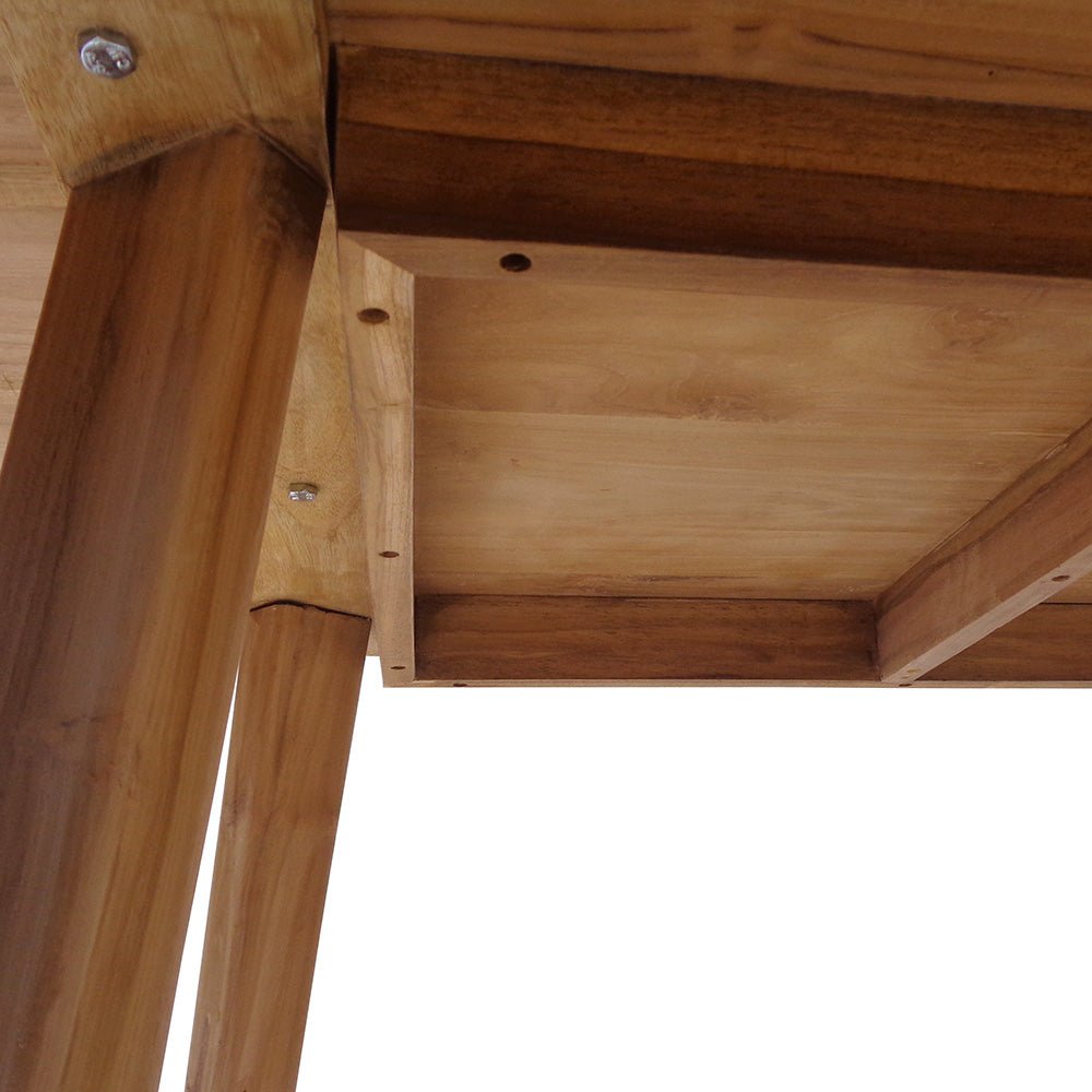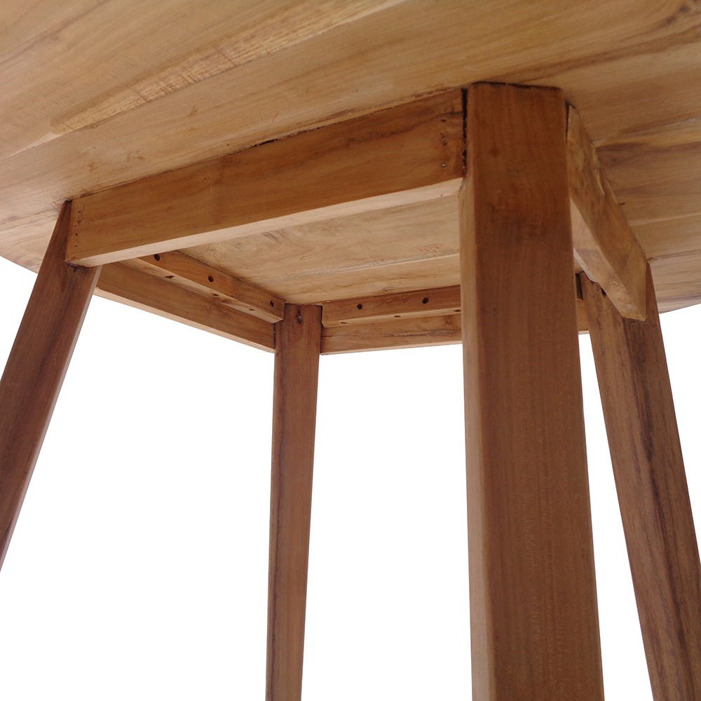Mesa de comedor redonda y rectangular fabricada en madera de teca color natural.