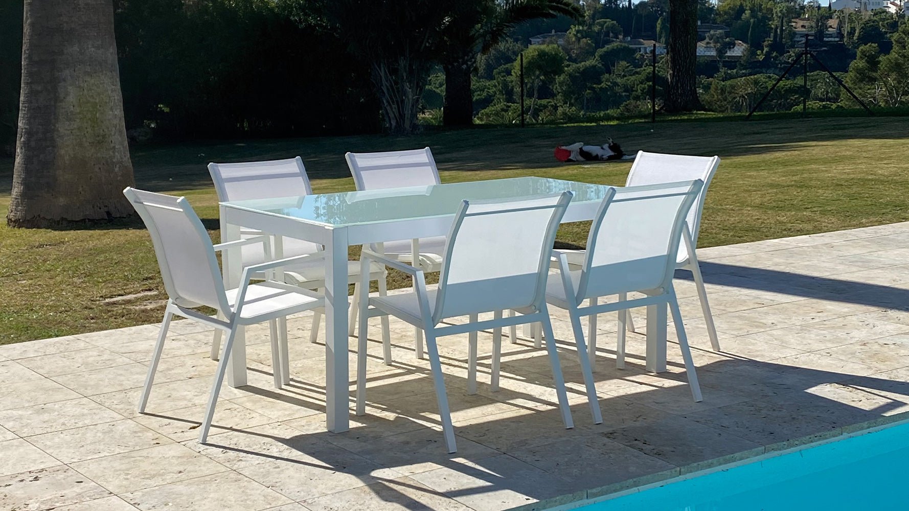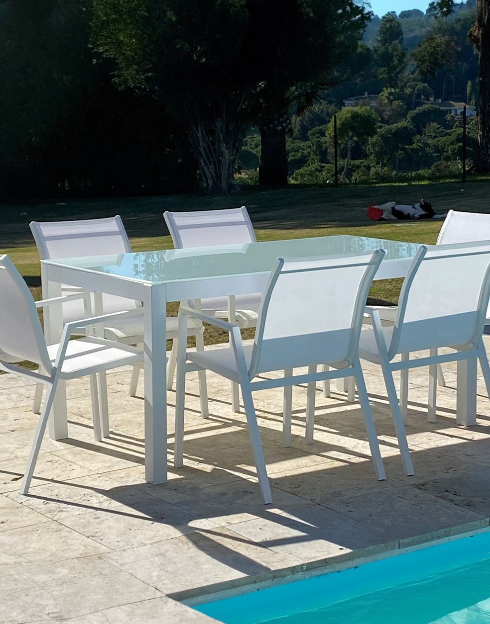 Mesa de aluminio blanco con tablero de cristal templado transparente semi-opaco tal y como se puede apreciar en las imágenes.
