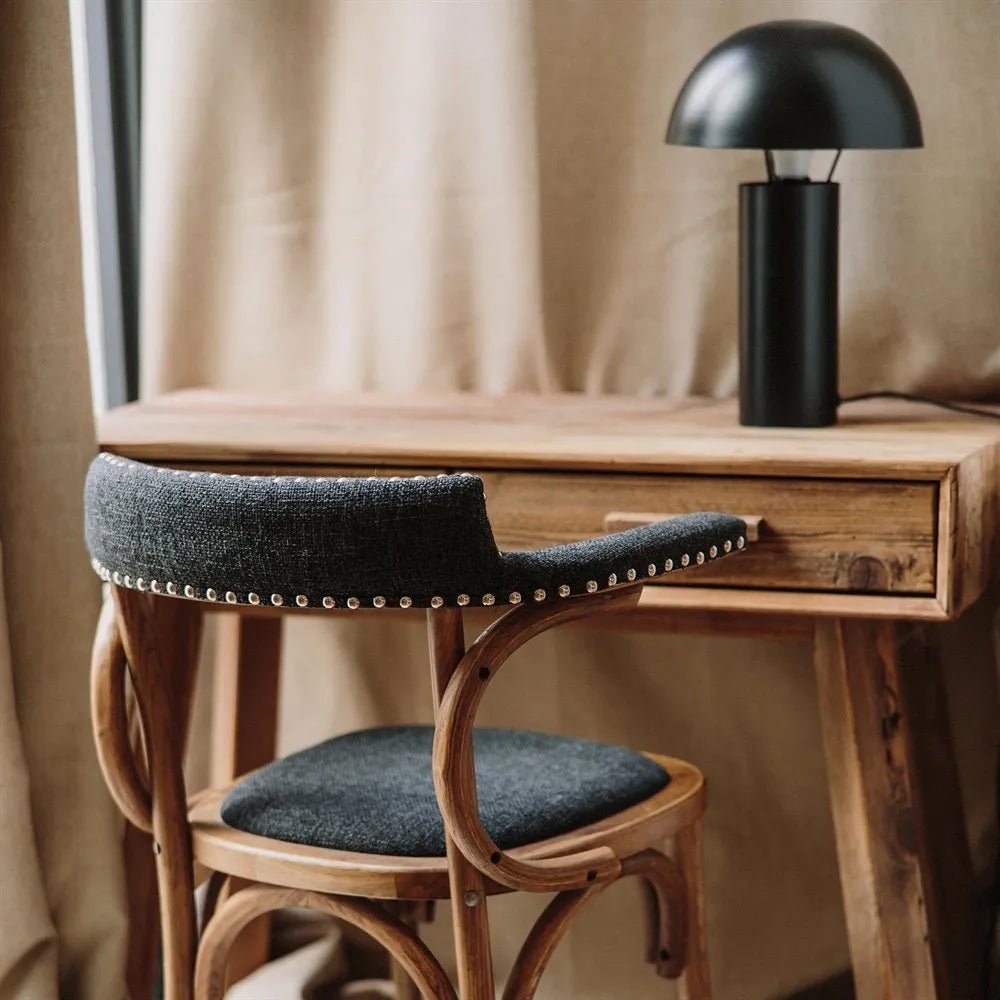 Mesa de estudio o consola tipo escritorio de estilo rústico fabricada en madera maciza de pino reciclado en color natural. Cuenta con dos cajones. No requiere montaje.