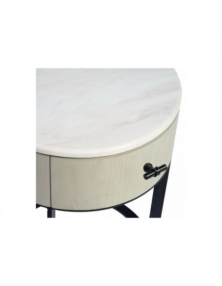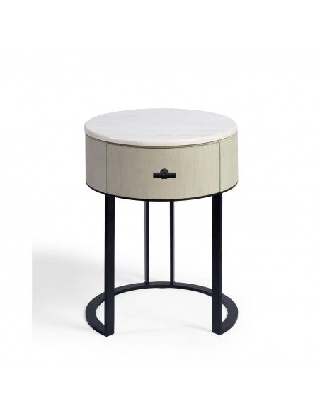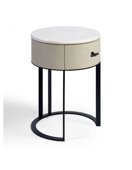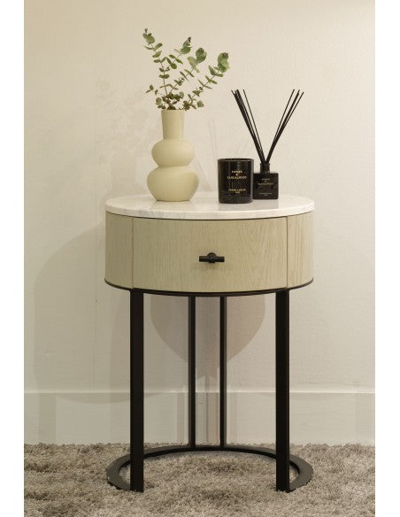 La mesita de noche Nook combina diseño contemporáneo y carácter natural en una pieza que destaca por su elegancia discreta. Su estructura redonda en madera de roble con acabado blanco grisáceo aporta luminosidad y calidez, mientras que el cajón frontal con tirador metálico en negro añade un toque moderno y funcional.
