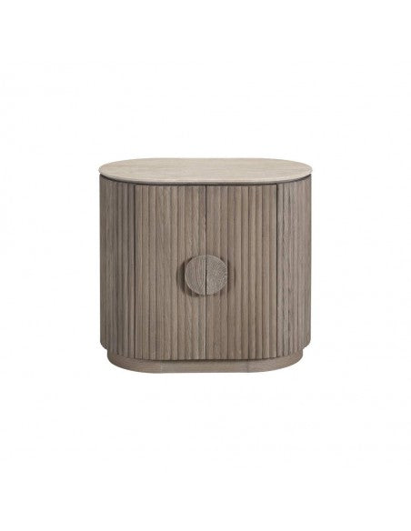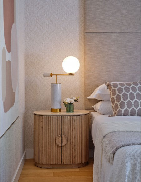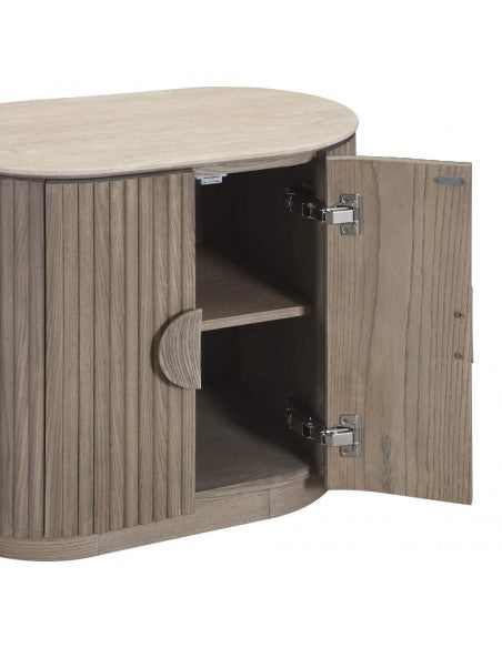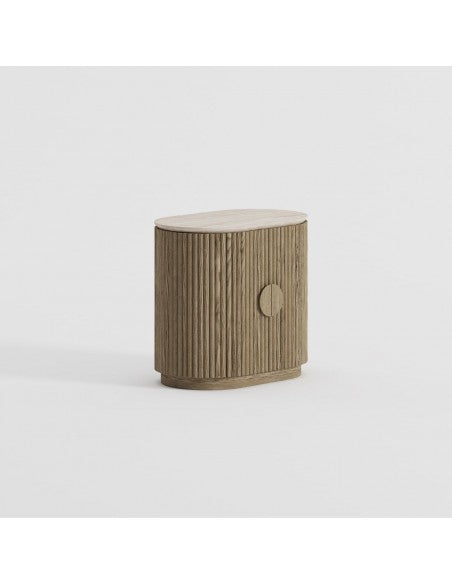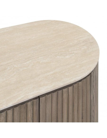 El diseño se completa con un sobre de travertino beige, una piedra natural que aporta textura, equilibrio y un carácter atemporal. Sus vetas orgánicas hacen que cada pieza sea única, creando un contraste refinado con la palillería clara de la base. El travertino añade una sensación de lujo discreto que eleva la presencia de la mesita sin sobrecargar el espacio.