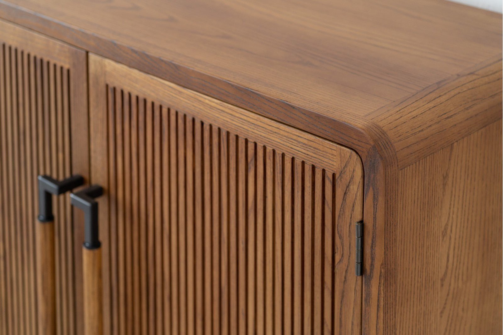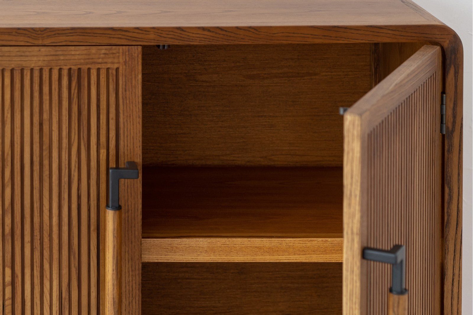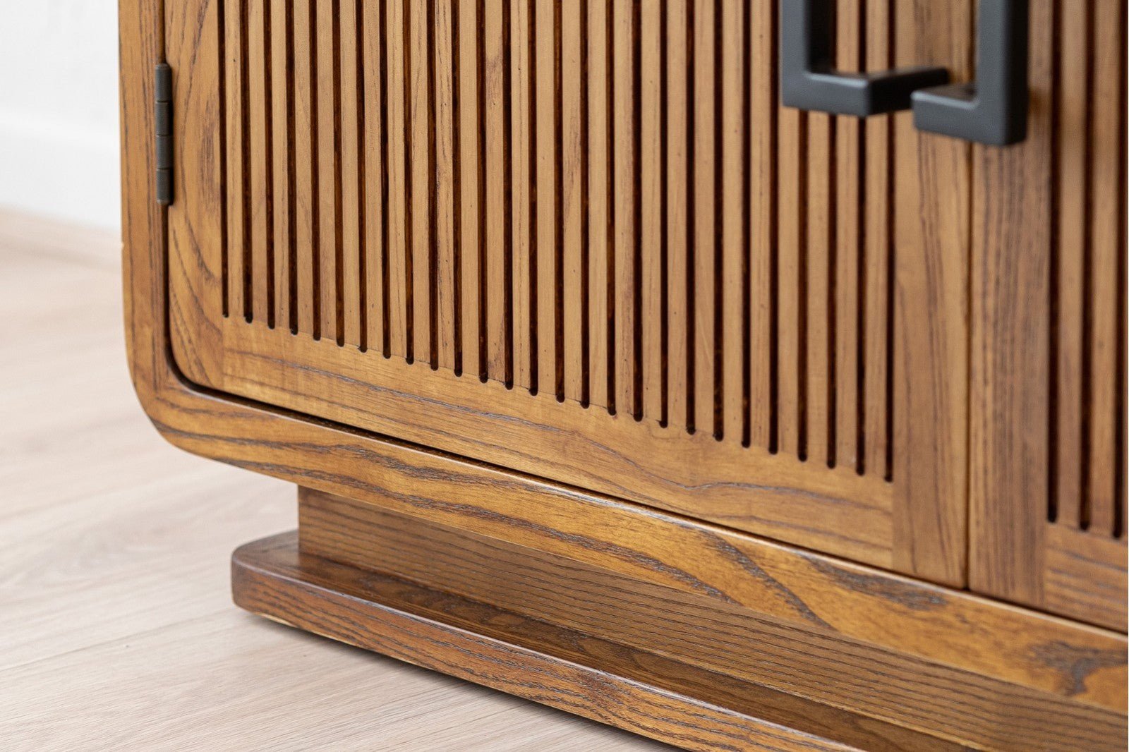 Fabricado en tablero contrachapado acabado en fresno natural con patas en madera maciza, destaca por sus líneas suaves y cantos redondeados que aportan armonía y elegancia al conjunto. Las puertas acanaladas se complementan con tiradores metálicos en negro mate, mientras que los detalles en fresno natural añaden un toque cálido y equilibrado.