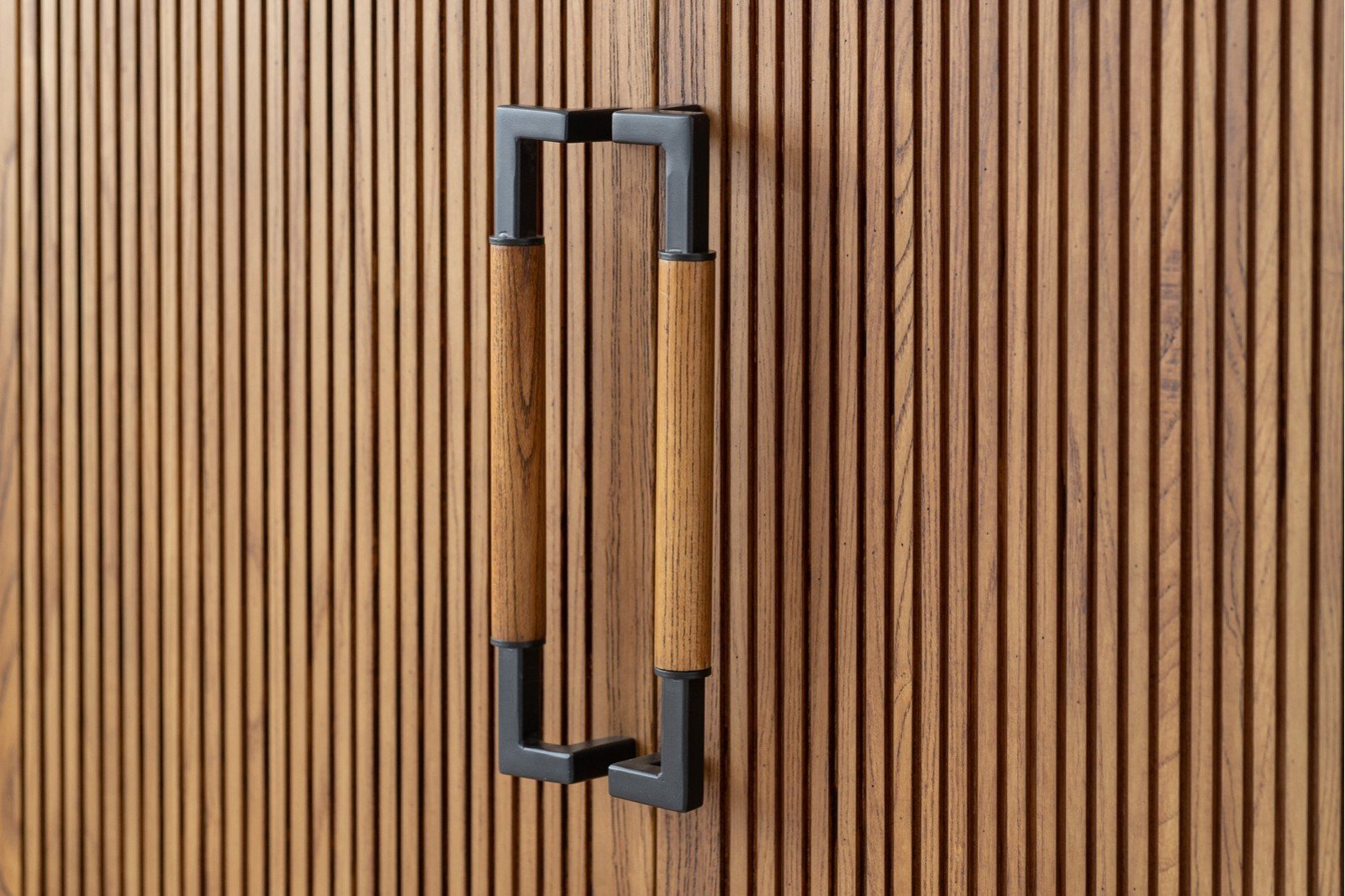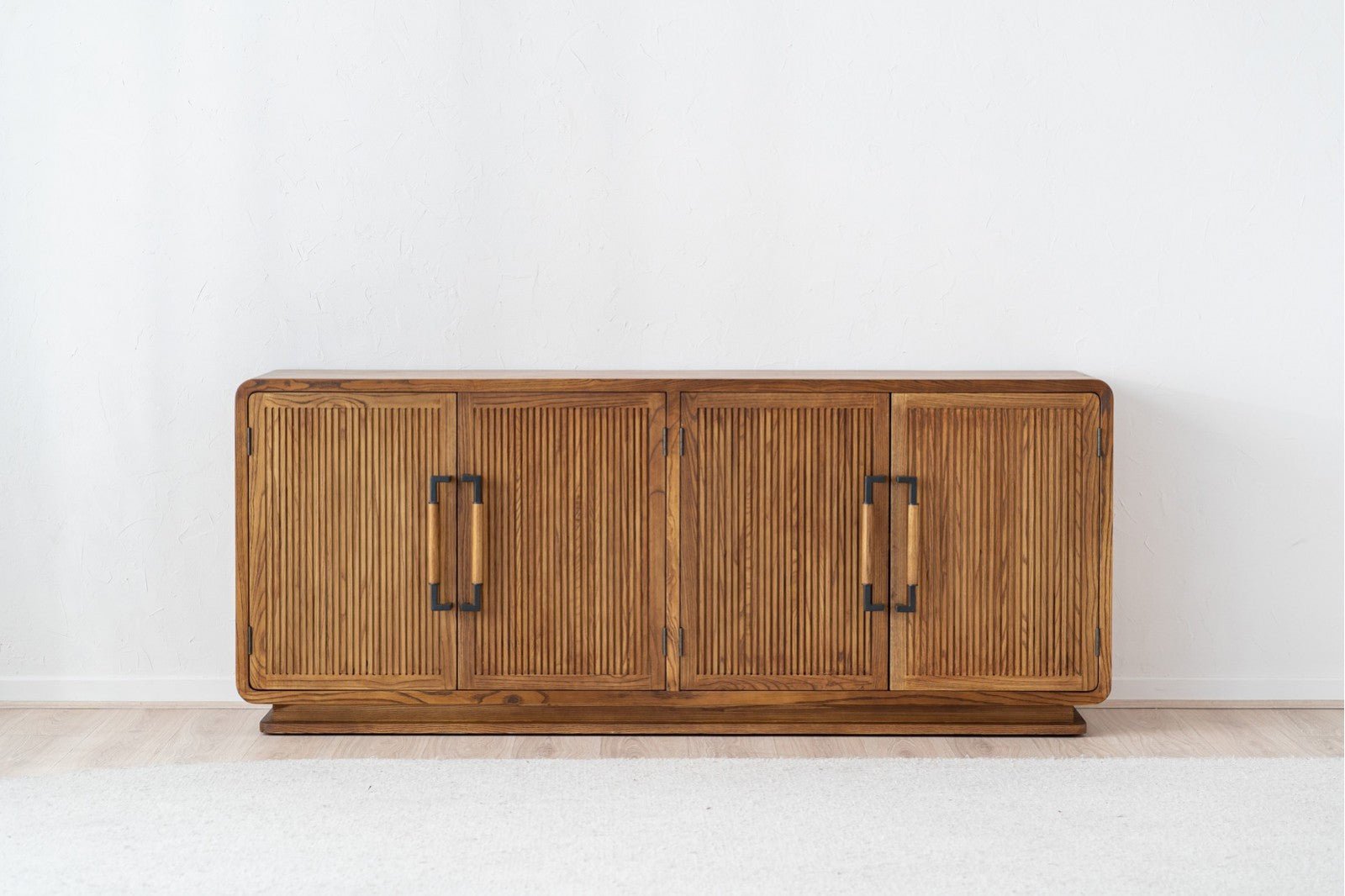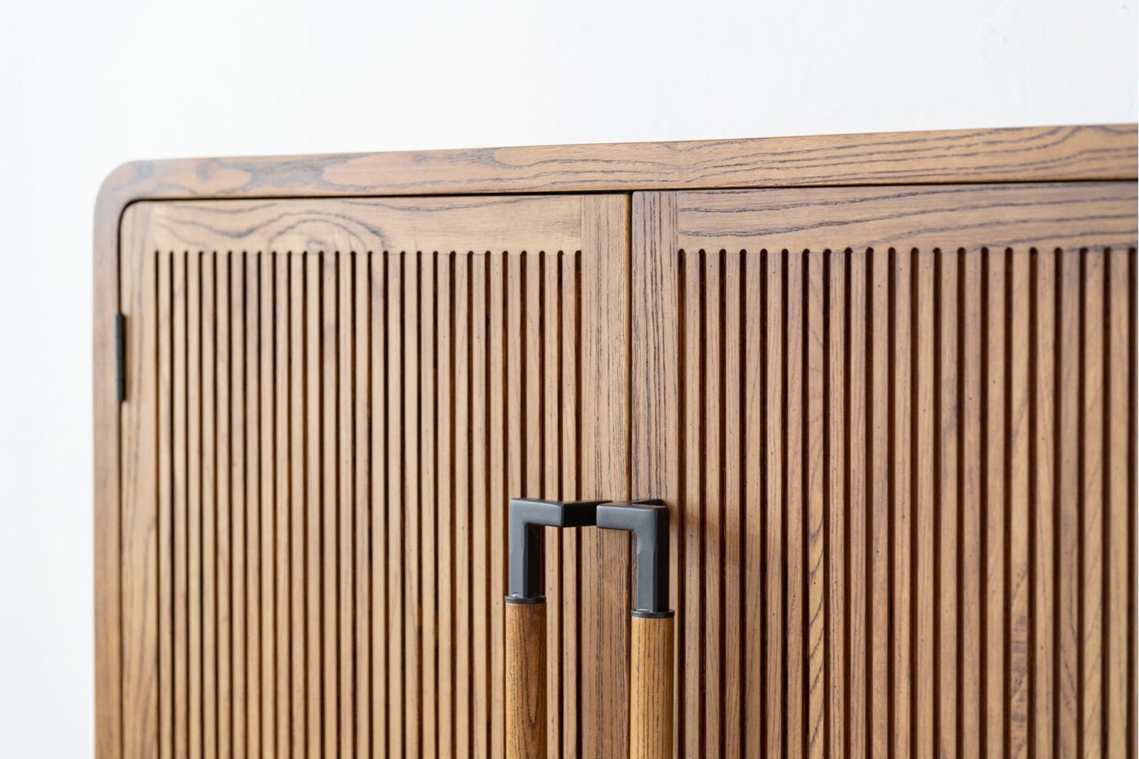 Fabricado en tablero contrachapado acabado en fresno natural con patas en madera maciza, destaca por sus líneas suaves y cantos redondeados que aportan armonía y elegancia al conjunto. Las puertas acanaladas se complementan con tiradores metálicos en negro mate, mientras que los detalles en fresno natural añaden un toque cálido y equilibrado.
