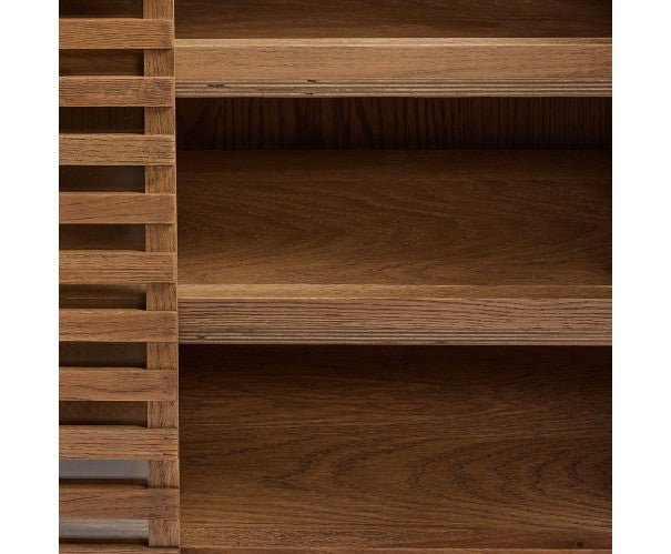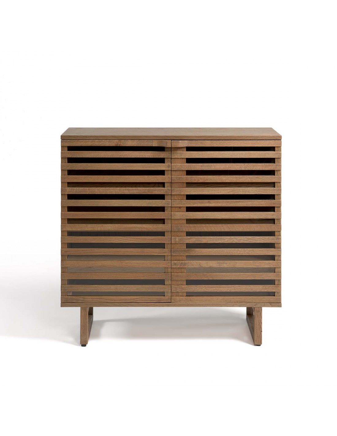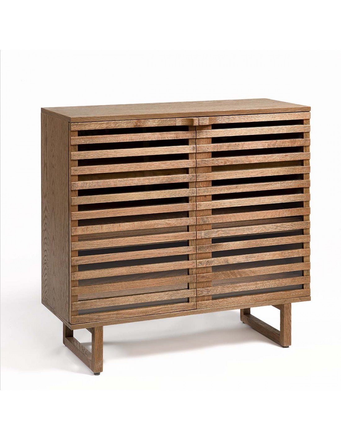 Aparador acabado en madera natural con pata de madera. Puertas de palillería en madera del mismo tono y parte interior de la puerta en cristal transparente. Cuenta con 3 baldas en su interior en las que la primera y tercera son ajustables. Permiten inclinación para usar como zapatero o utilizar rectas para otro tipo de almacenaje. Su estructura y diseño permiten utilizar la pieza como zapatero. Un diseño moderno y ligero a la vez que resistente.
