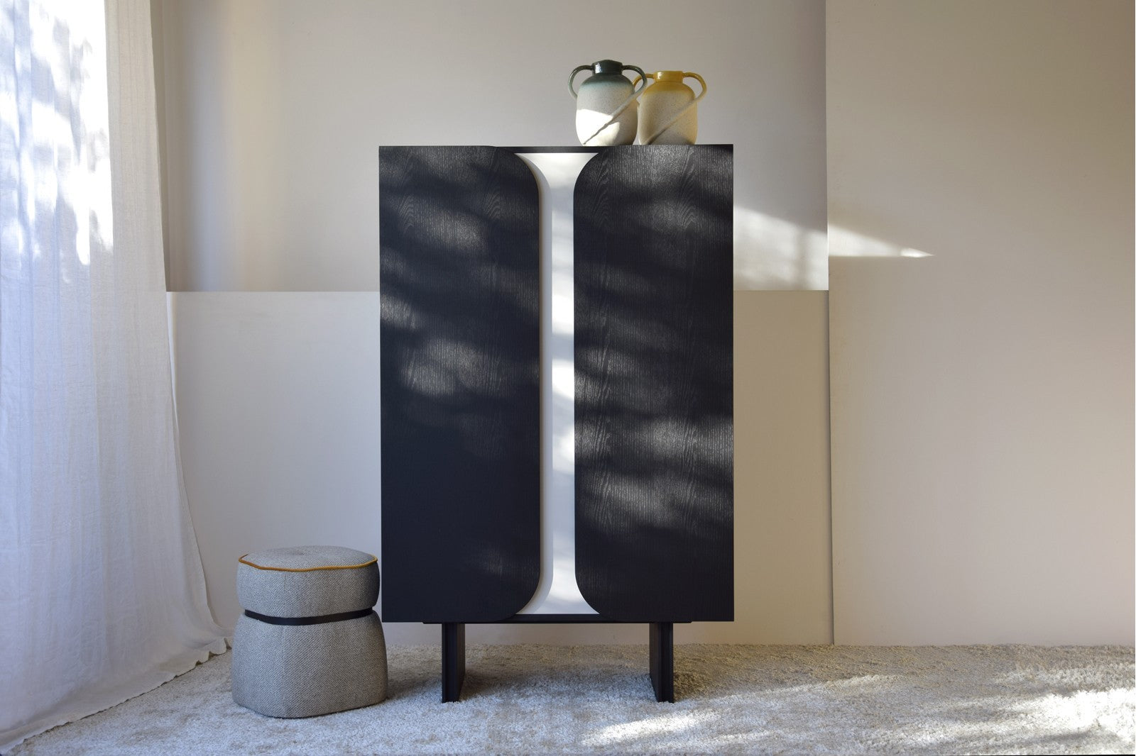 Armario de la colección Curva que combina un diseño contemporáneo de líneas suaves con una elegante mezcla de acabados, aportando personalidad y funcionalidad a cualquier espacio.