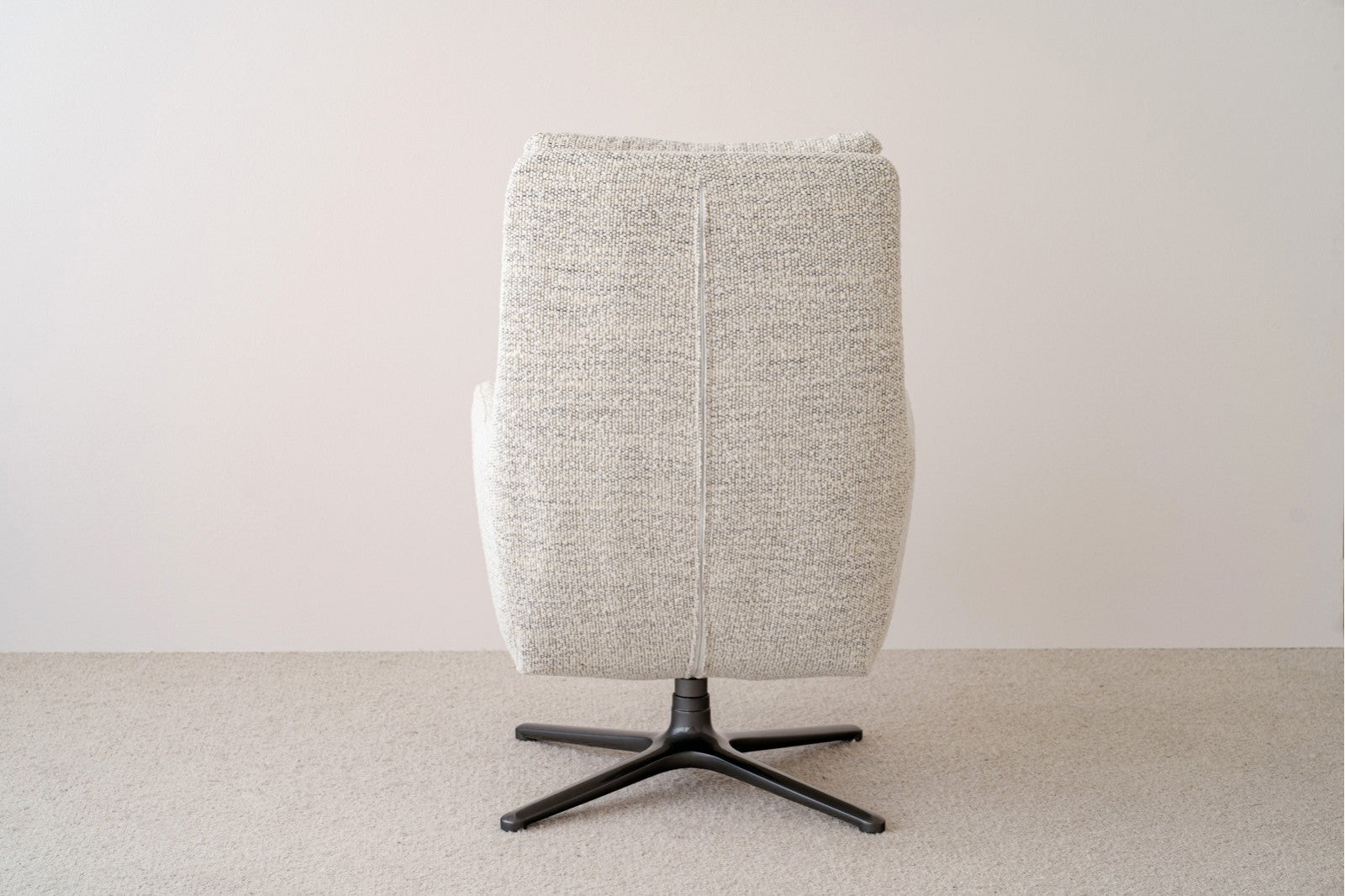 Butaca de diseño giratoria con pie de acero tapizada mezclando tonos beige y gris. Tejido 95% poliéster y el resto acrílico. Las patas requieren montaje. Una butaca ideal para cualquier rincón de su hogar.
