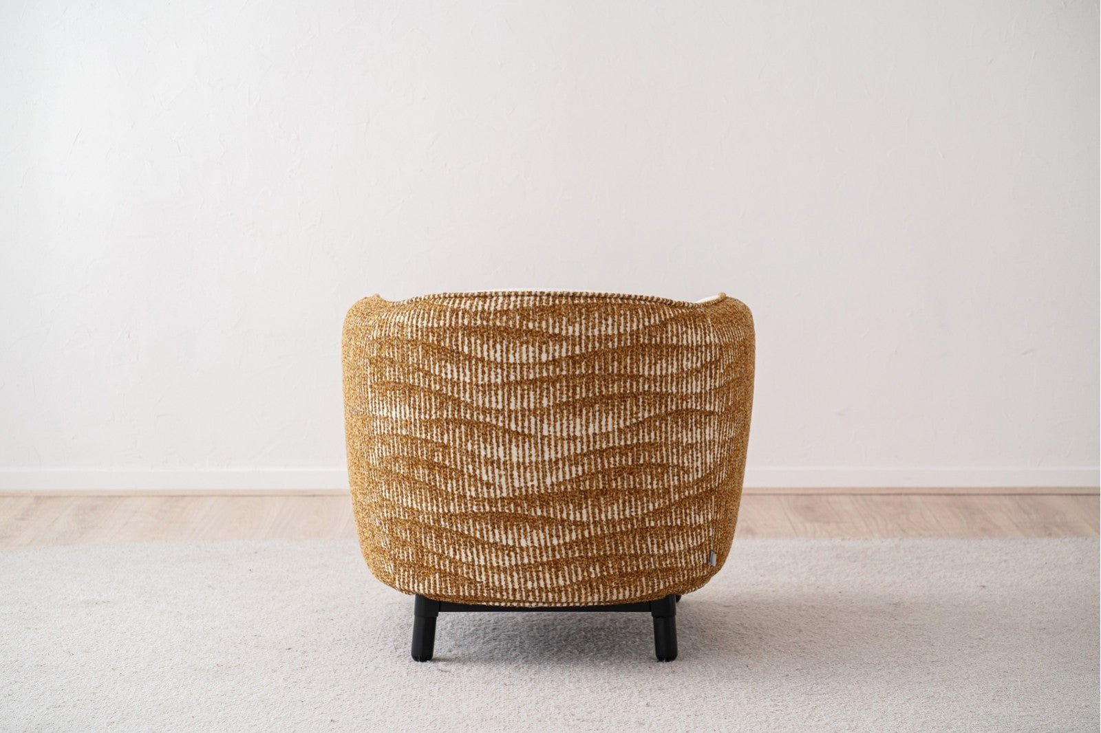 La butaca Vurca combina estilo contemporáneo y confort excepcional, convirtiéndose en una pieza ideal para ambientes sofisticados o de aire natural. Su diseño de líneas curvas aporta suavidad visual, mientras que el doble tapizado crea un contraste elegante: el interior en blanco roto con textura bouclé, suave y acogedor, se combina con un tejido exterior estampado en tonos ocres y mostaza, que añade carácter y personalidad.