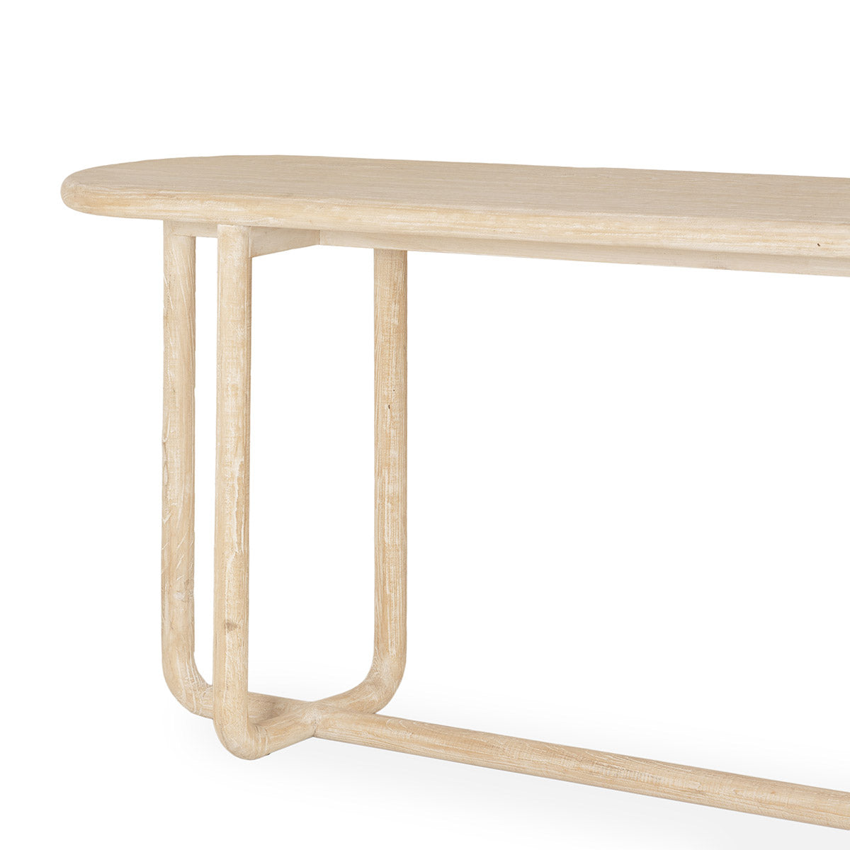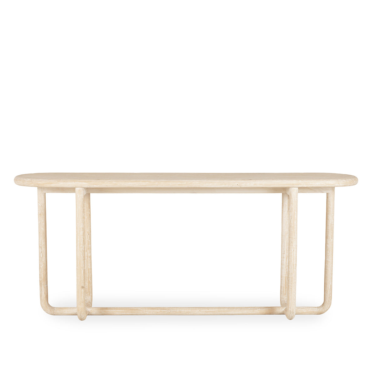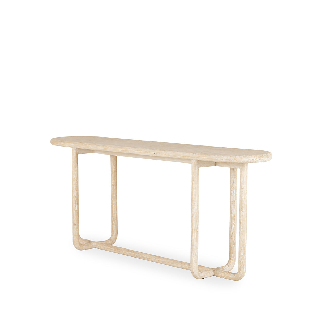 Esta consola de madera de olmo se distingue por su fuerte personalidad y su diseño original, en el que la estructura de pies cruzados se convierte en el principal elemento decorativo. El sobre ovalado aporta equilibrio y suavidad al conjunto, dando como resultado una pieza elegante y con carácter artesanal.