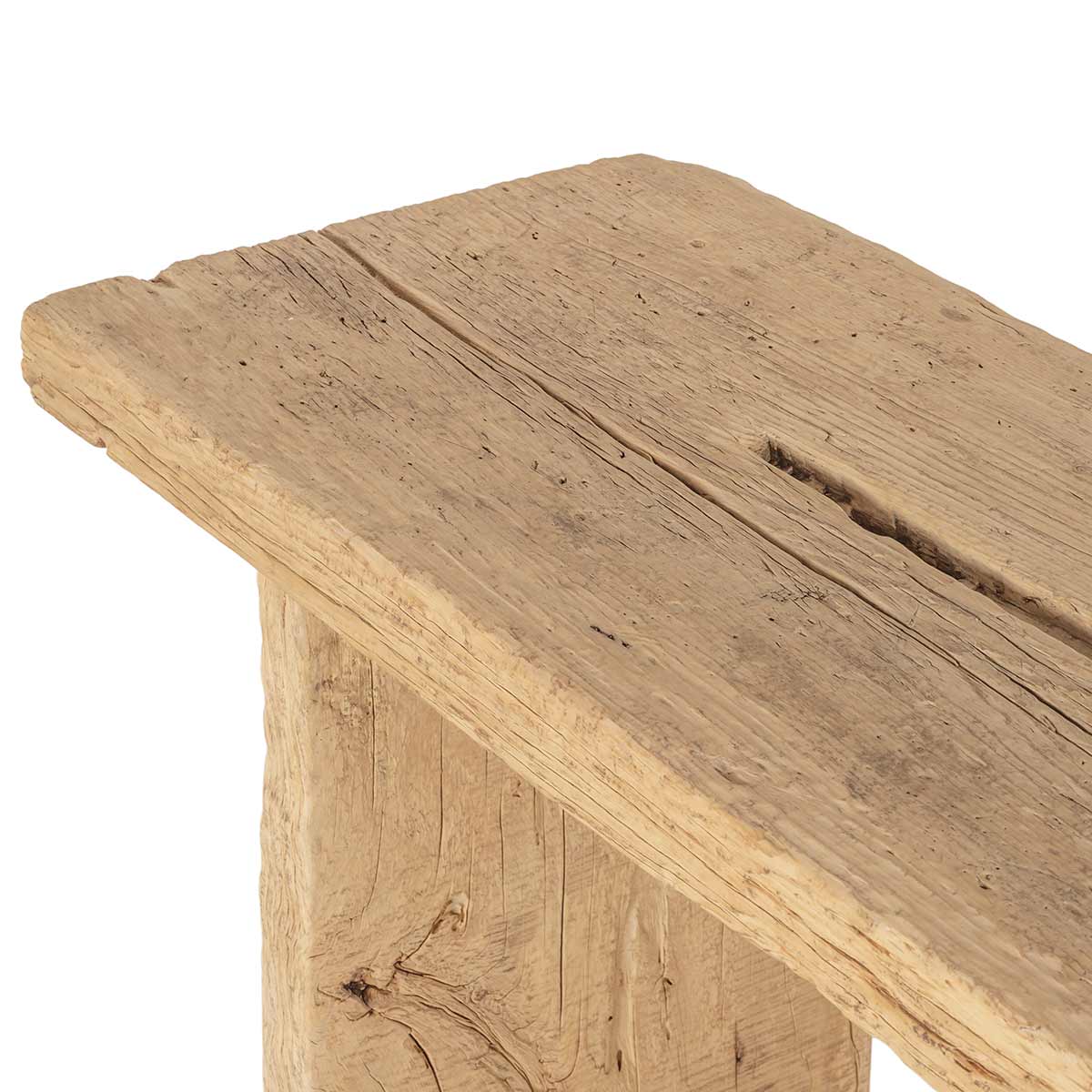 La madera de olmo presenta tonos naturales y luminosos, con vetas marcadas, texturas orgánicas e imperfecciones visibles que aportan carácter y autenticidad a cada pieza. Estas singularidades hacen que cada consola sea única, reflejando un acabado honesto y artesanal.