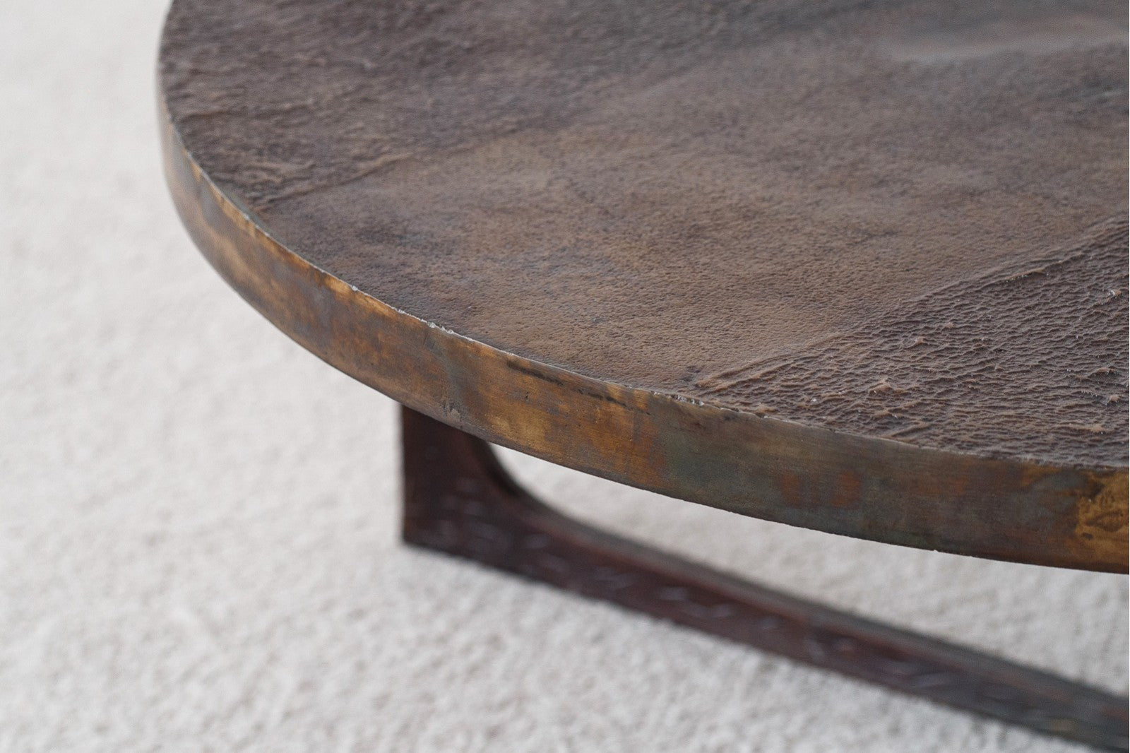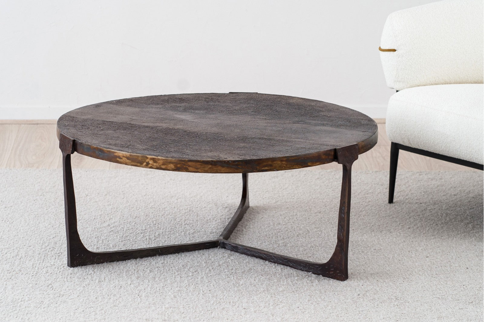 Mesa de centro de diseño artesanal que combina hierro y aluminio en un elegante acabado latón envejecido. Su superficie redonda e irregular y sus líneas simples y ligeras crean un contraste armonioso con la contundencia de los materiales, convirtiéndola en una pieza decorativa única.