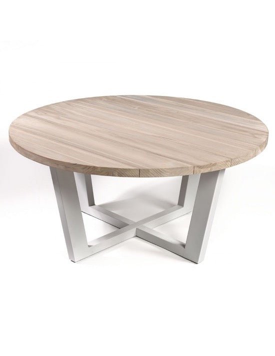 Mesa de comedor redonda con tablero de madera de teca apta para uso exterior o interior. Pata de metal color topo claro. El porche o jardín se convertirá en un espacio para las reuniones en familia o amigos con esta singular pieza en madera tono claro y pata de metal en tono beige topo. La disposición de las patas le dan una estabilidad extra a la vez que no impiden la comodidad de los comensales.