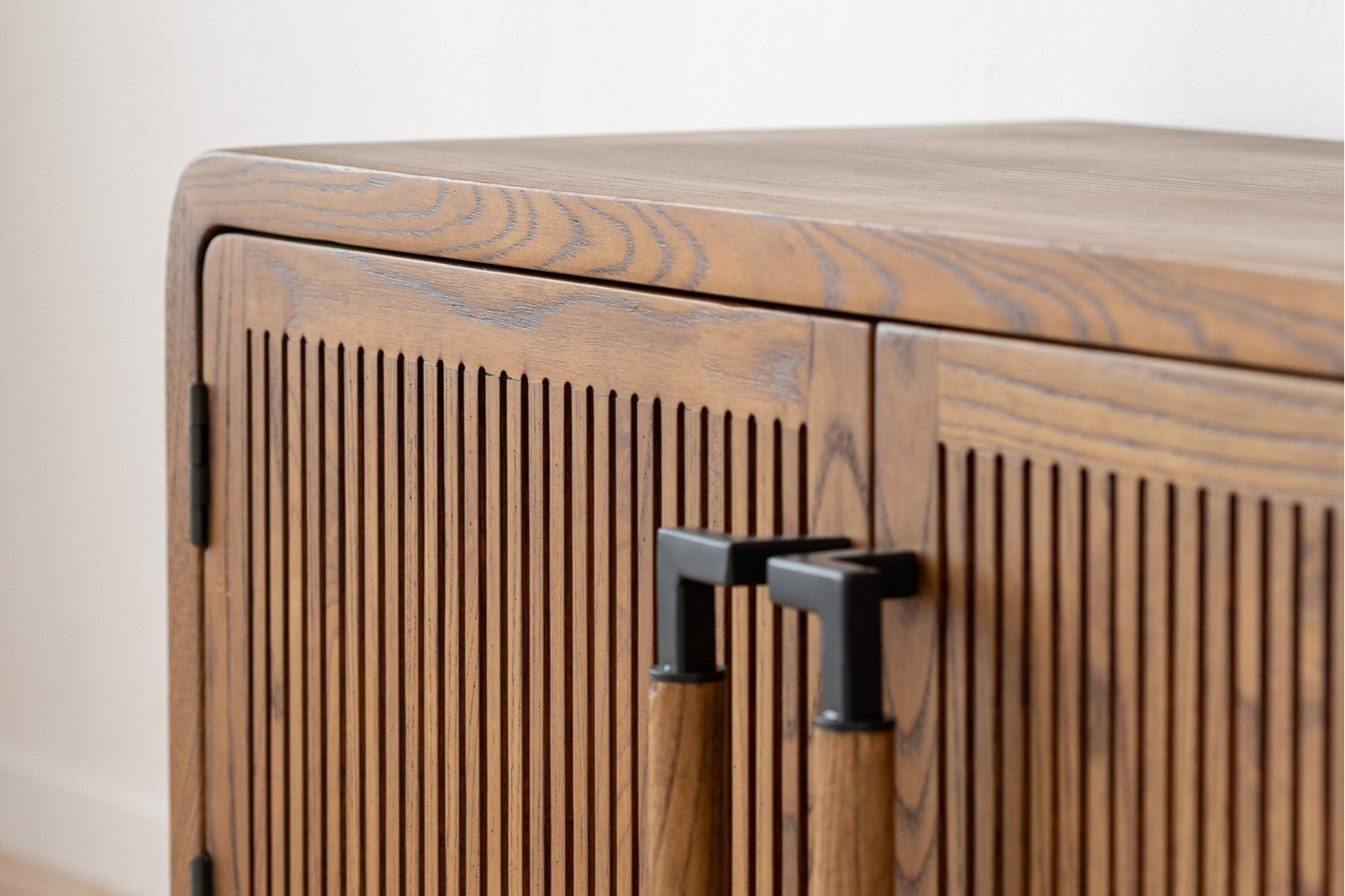 Fabricado en tablero contrachapado acabado en fresno natural con patas en madera maciza, presenta líneas suaves y cantos redondeados que aportan armonía y elegancia. Las puertas acanaladas se complementan con tiradores metálicos en negro mate y detalles en fresno, que aportan un toque cálido y sofisticado.