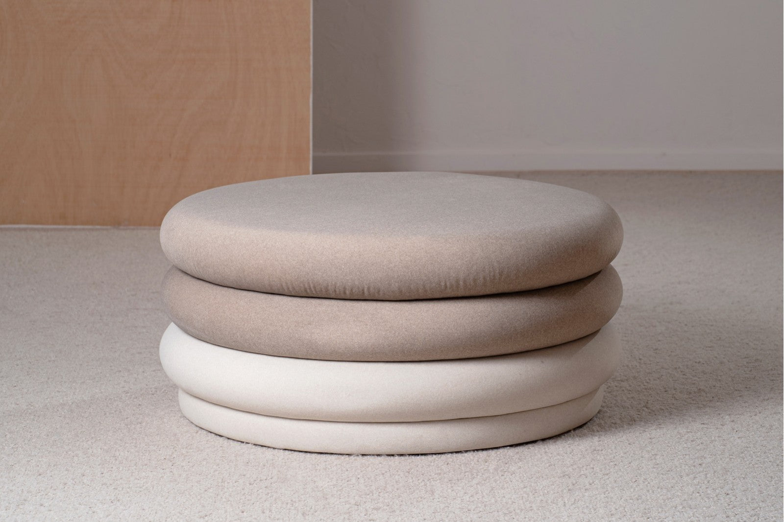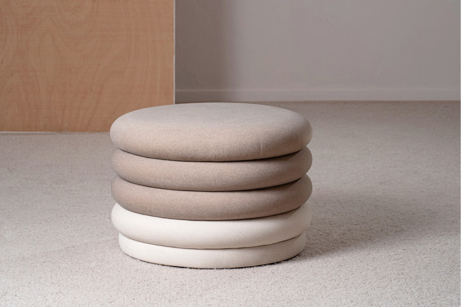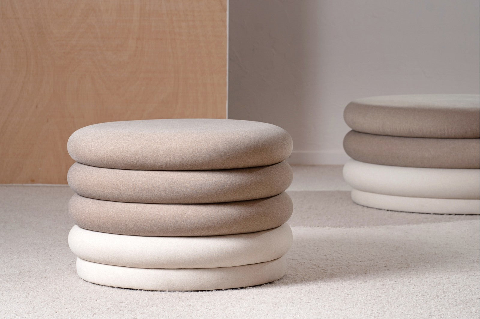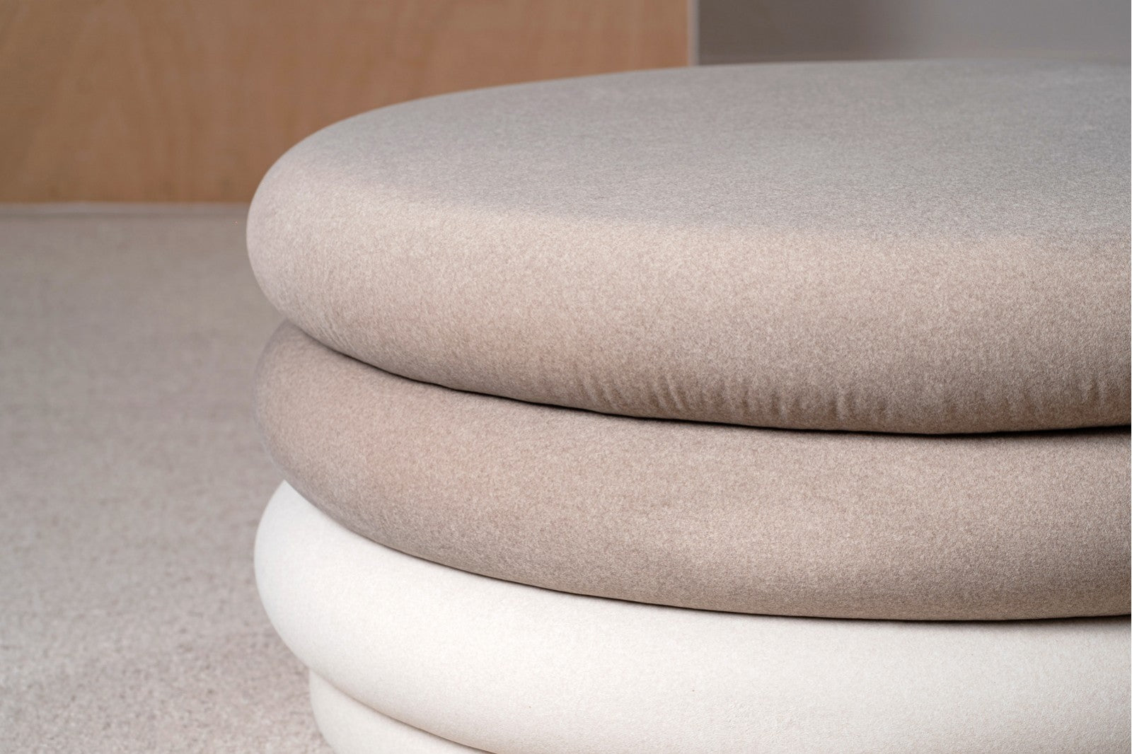 Destaca por su estructura original formada por aros apilados, que aportan dinamismo y un carácter único al diseño. El tapizado combina dos tejidos: los aros superiores en textura suave color topo y el aro inferior en tono marfil, incluyendo también la base. Esta combinación de colores neutros y contrastes sutiles realza la silueta y aporta un acabado elegante y contemporáneo.