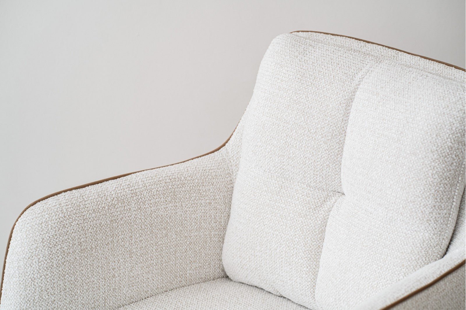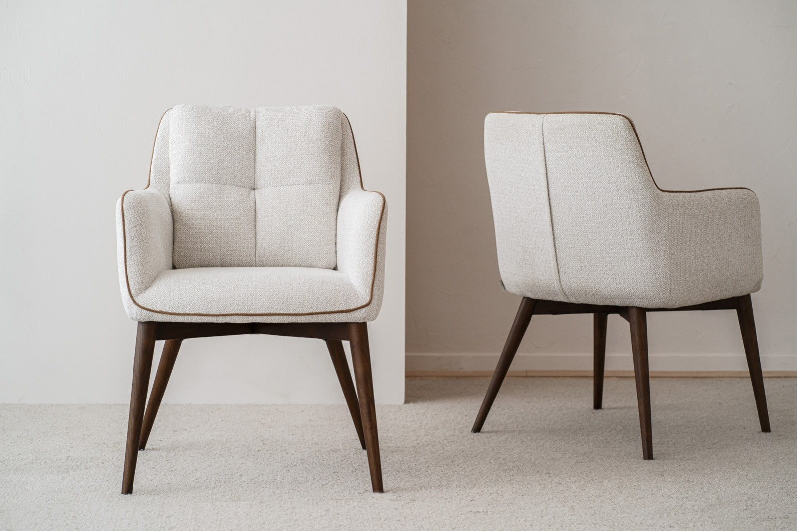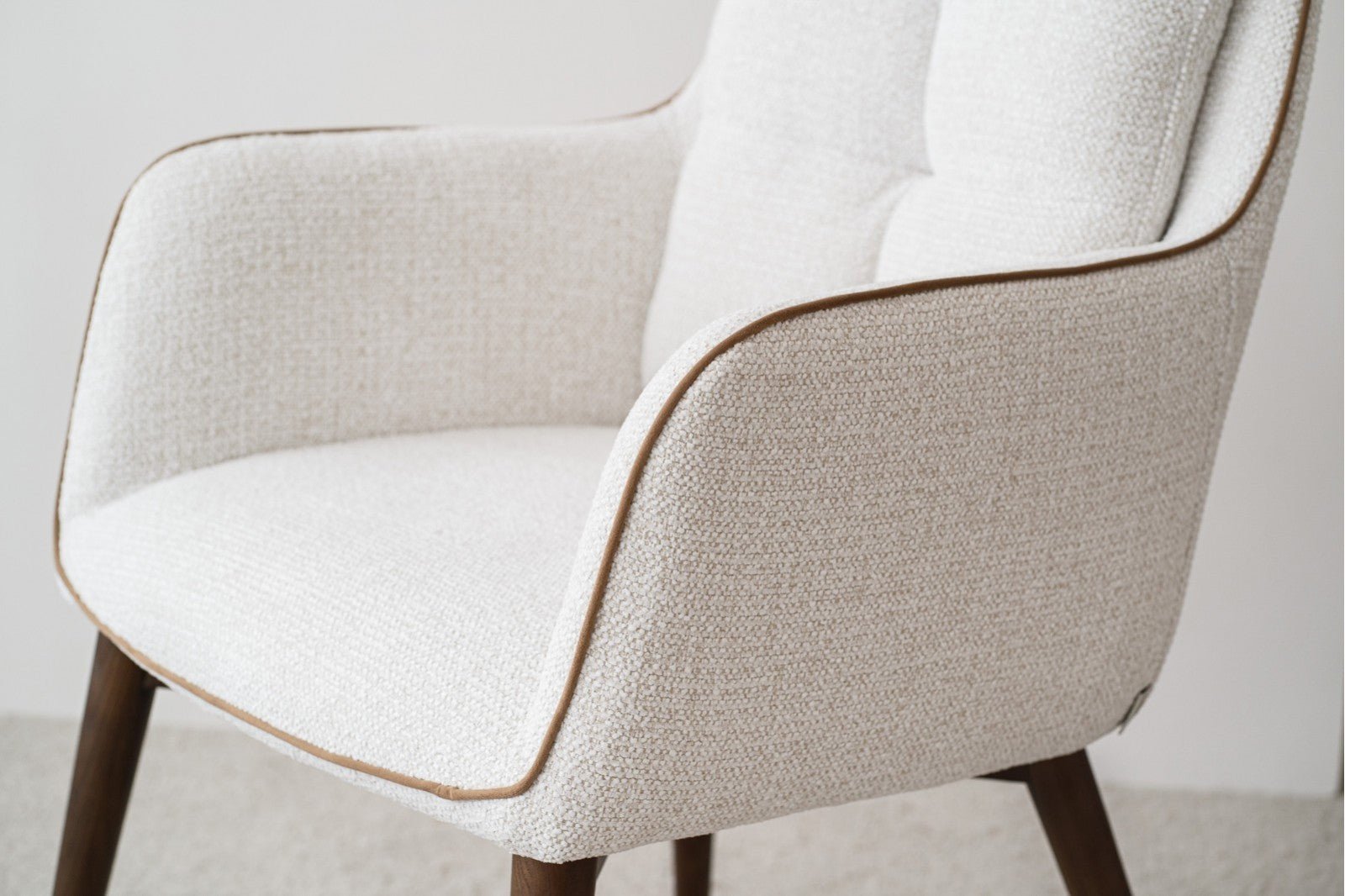 Su diseño se realza con un vivo en terciopelo a contraste, que aporta un toque sofisticado y distintivo, destacando los contornos suaves y las líneas redondeadas que caracterizan esta colección. La forma ergonómica del respaldo y los brazos integrados invitan a disfrutar de largas sobremesas con la máxima comodidad.