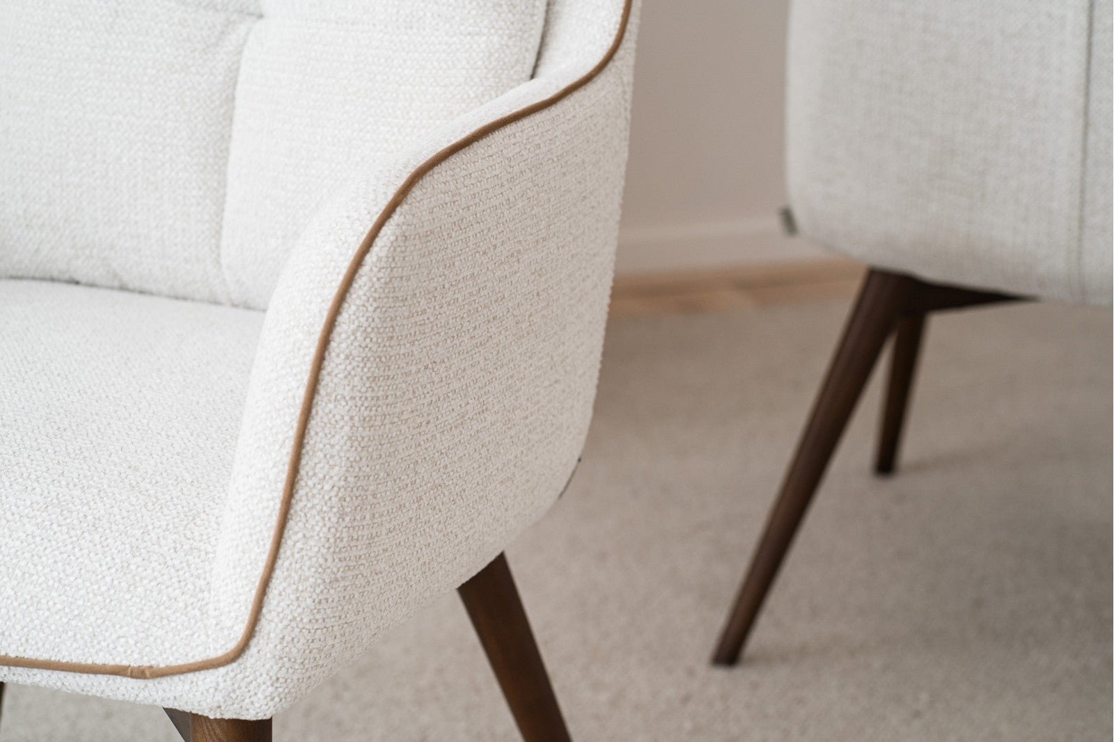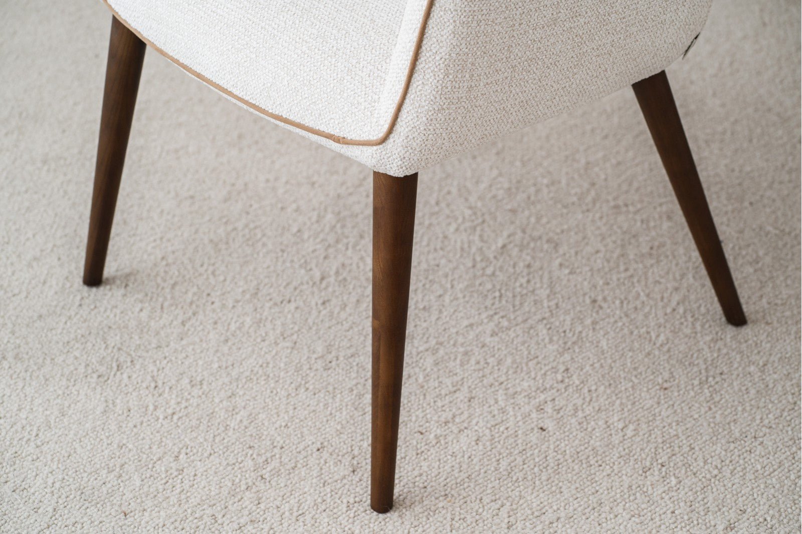 Las patas de madera con acabado nogal aportan estabilidad, calidez natural y un aire contemporáneo, equilibrando el diseño textil con un toque orgánico y elegante.
