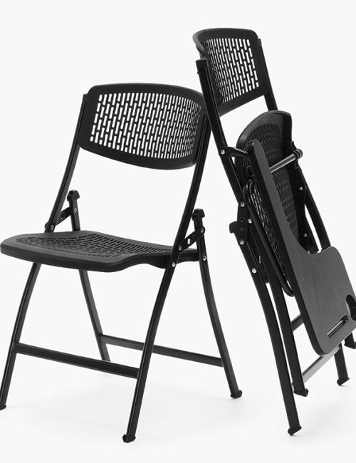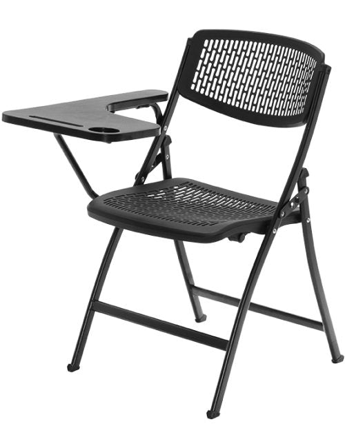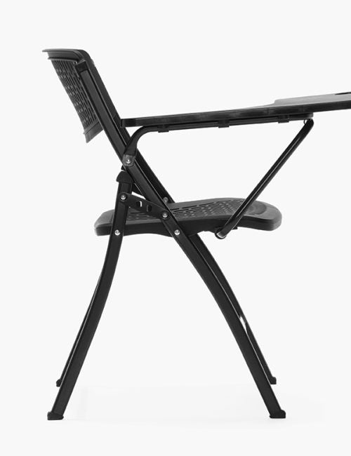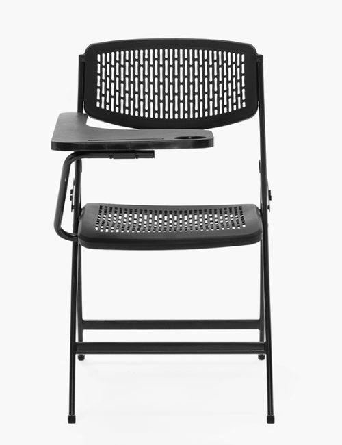 Fabricada con una estructura de acero oval pintado en epoxi negro, combina solidez y ligereza. El asiento y respaldo de polipropileno inyectado presentan una superficie perforada que favorece la transpiración y distribuye el peso del usuario de forma homogénea. Incluye pala abatible de PVC color negro, ideal para tomar notas o trabajar con dispositivos ligeros.