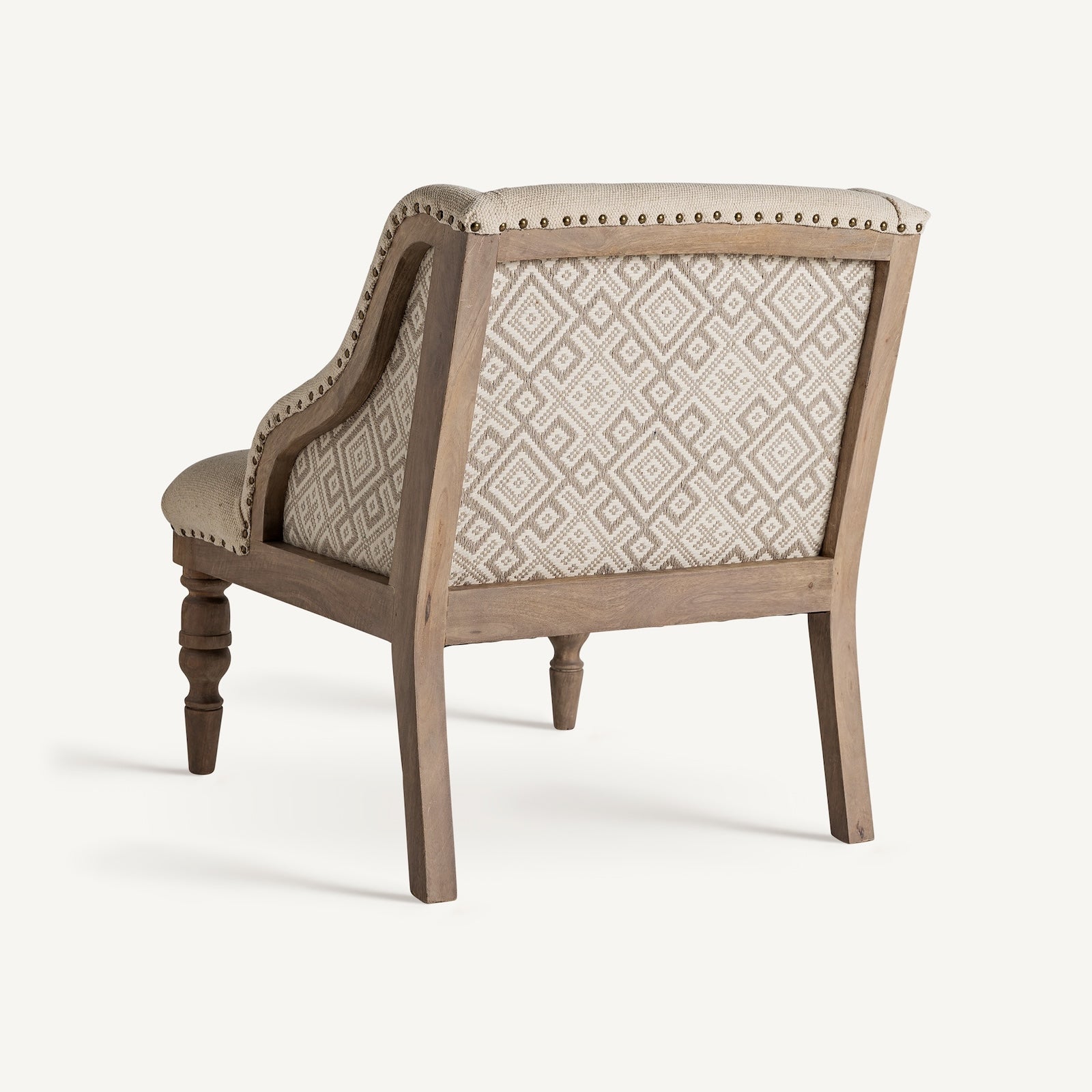 Sillón de estilo colonial, fabricado en madera de mango en color marrón, combinado con poliéster en color beige.