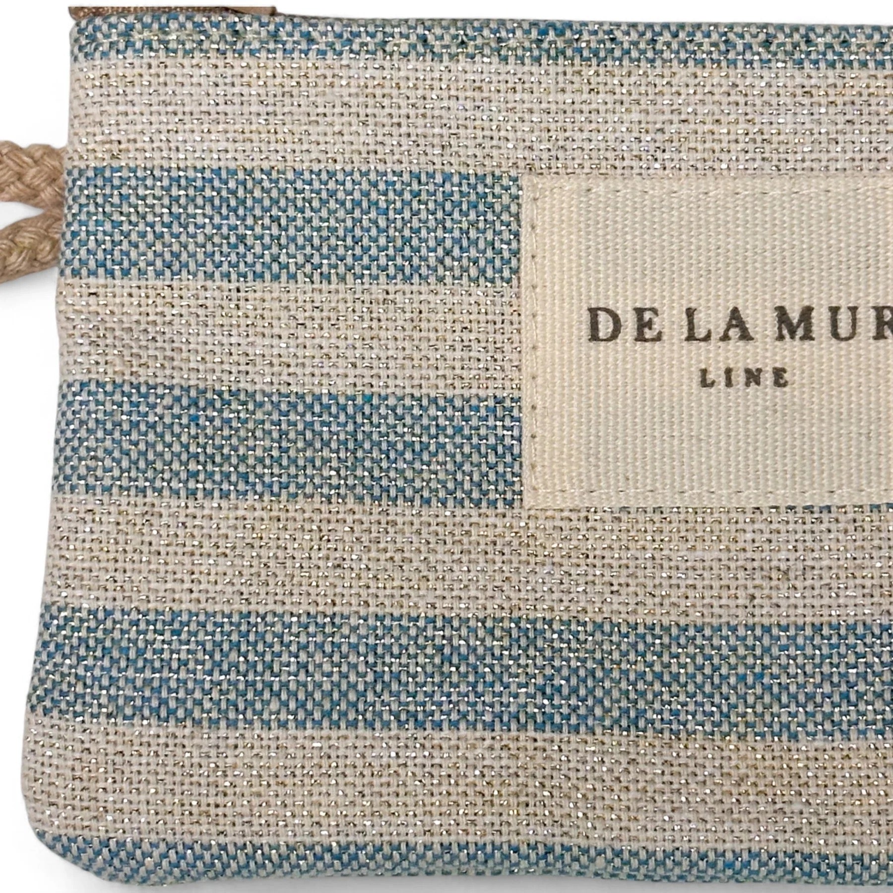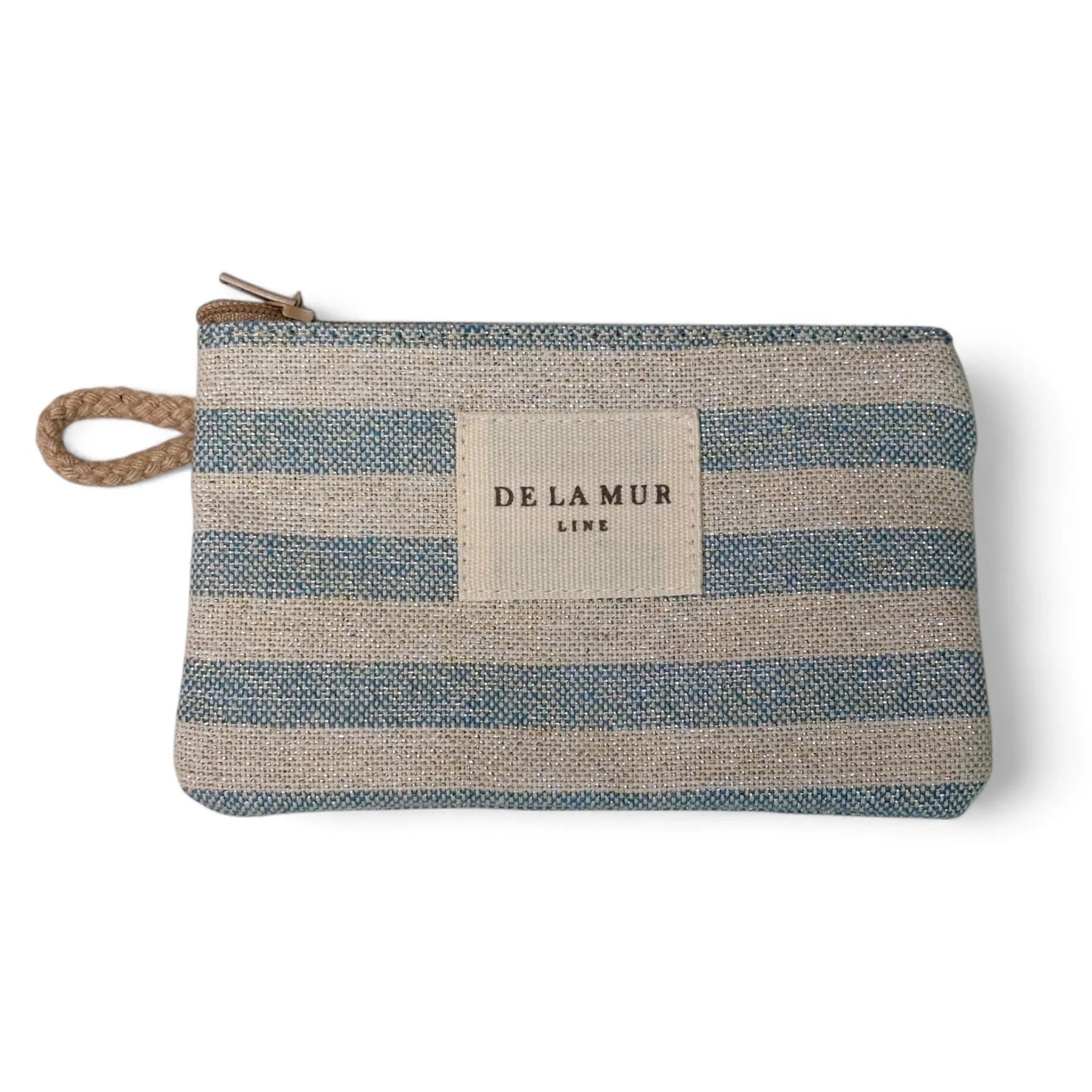 Monedero con cremallera en la parte superior y pequeña asa de cordón de color beige en el lateral. Con tejido fino de half-panama con estampado a rayas de color azul y crudo con lurex brillante dorado y plateado. Cada articulo puede tener una variación en el estampado, dependiendo de donde se haya efectuado el corte de la pieza. Forrado de tejido grueso de color gris en la parte interior. Para su correcto mantenimiento se aconseja lavarlo en frío a mano y no utilizar secadora. Ideal para llevar billetes, monedas y tarjetas. Cabe bien dentro de cualquier tamaño de bolso.