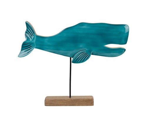 Preciosa figura decorativa en forma de ballena fabricado en madera de mango e hierro color azul.