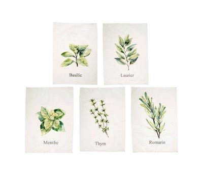 Preciosos paños de cocina con dibujo de plantas aromáticas varias fabricados 100% algodón color blanco y tonos verdes.