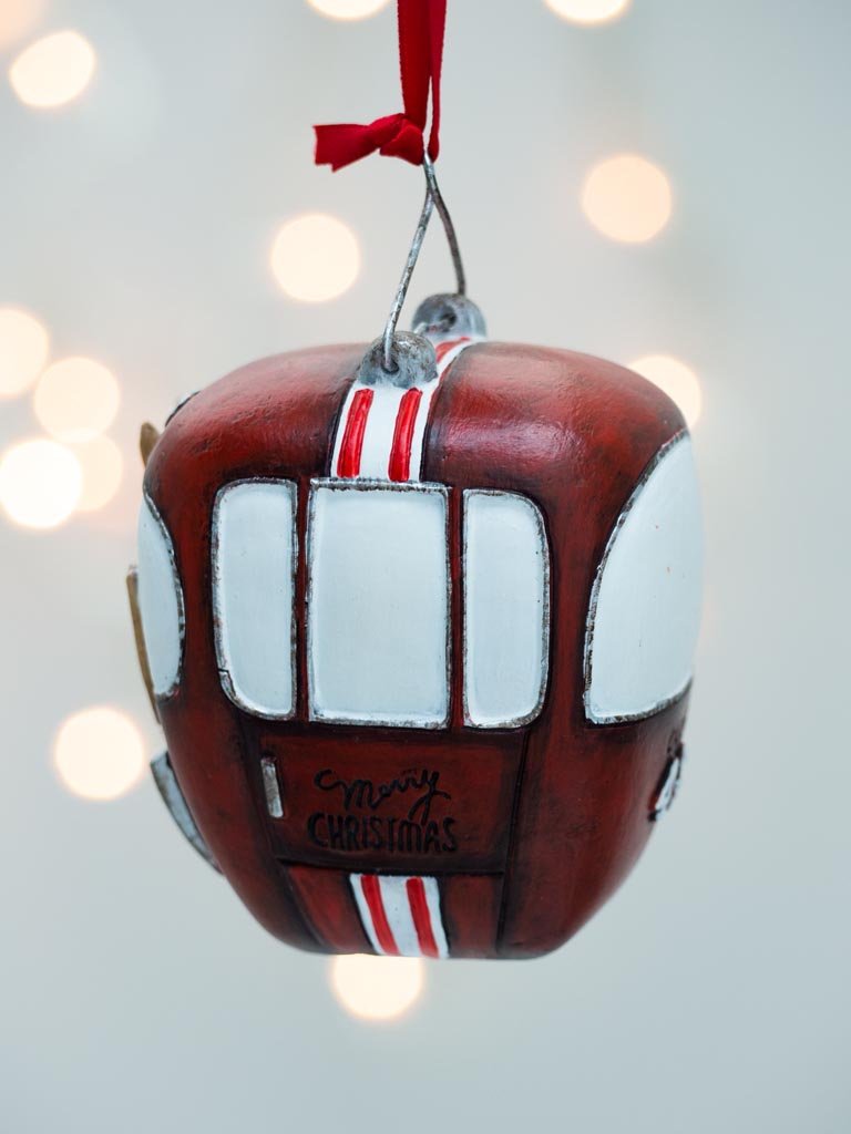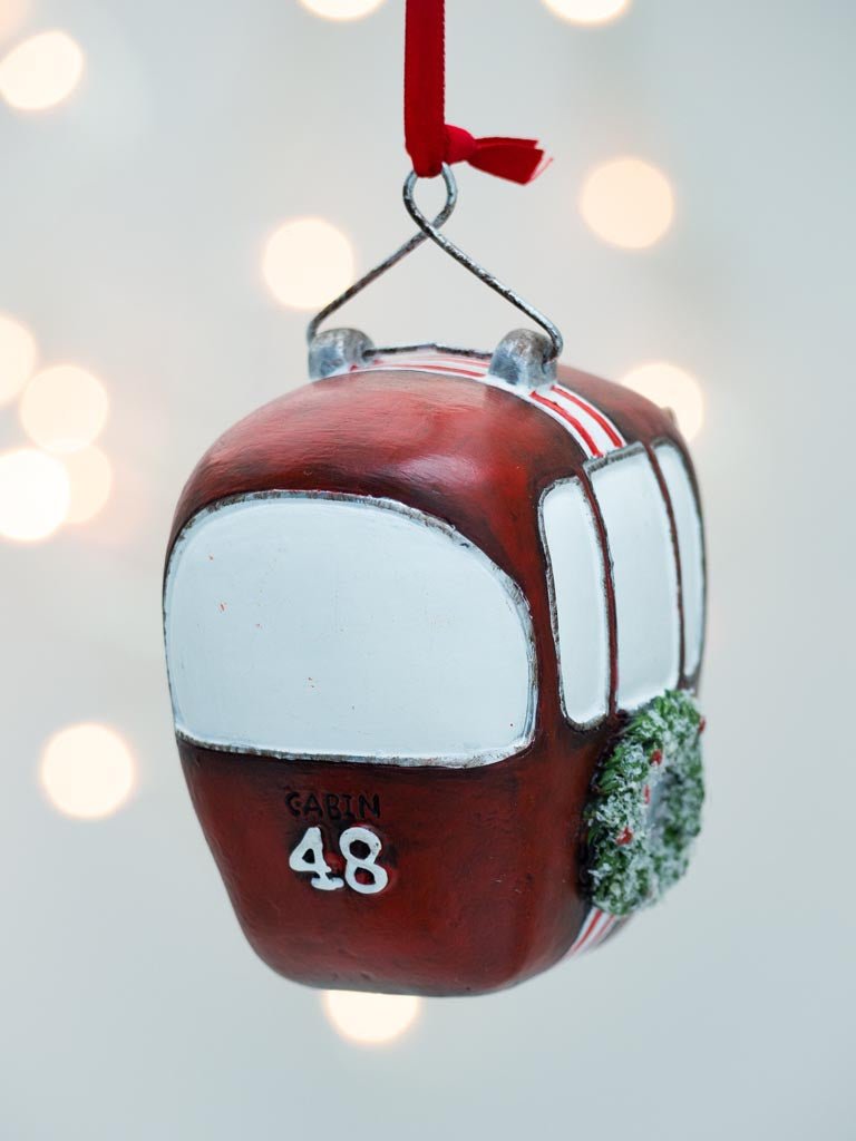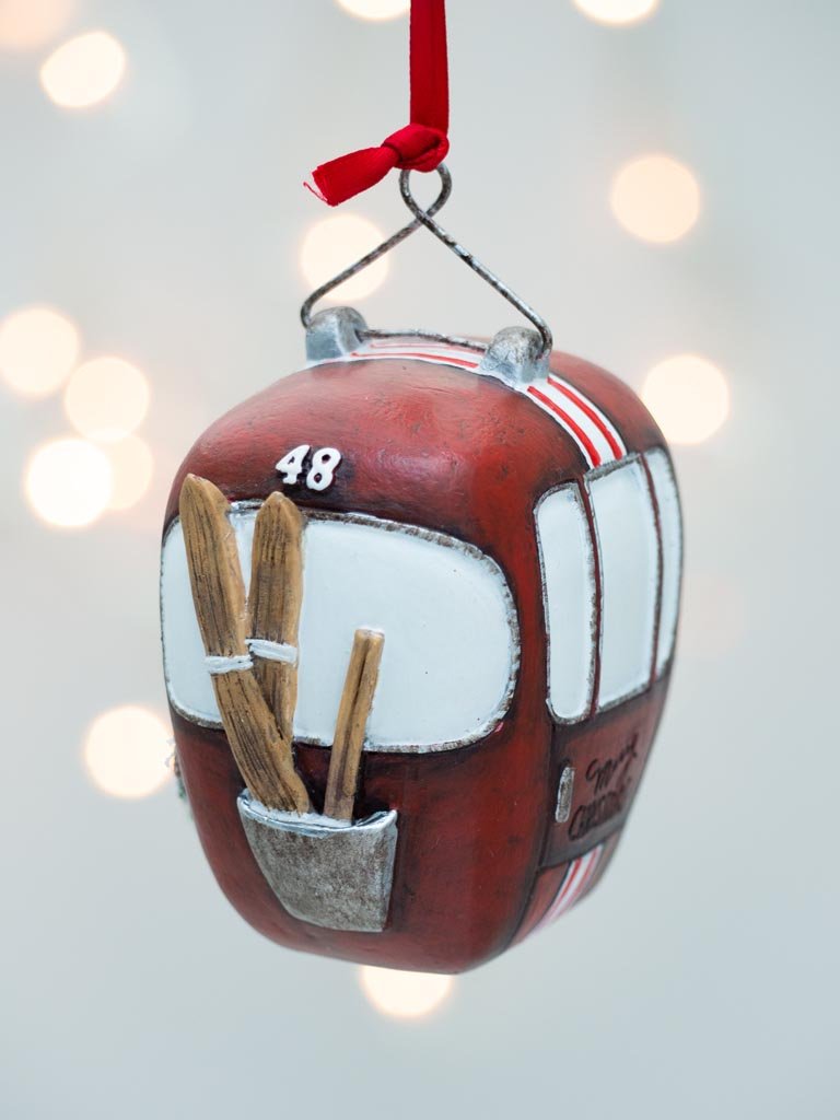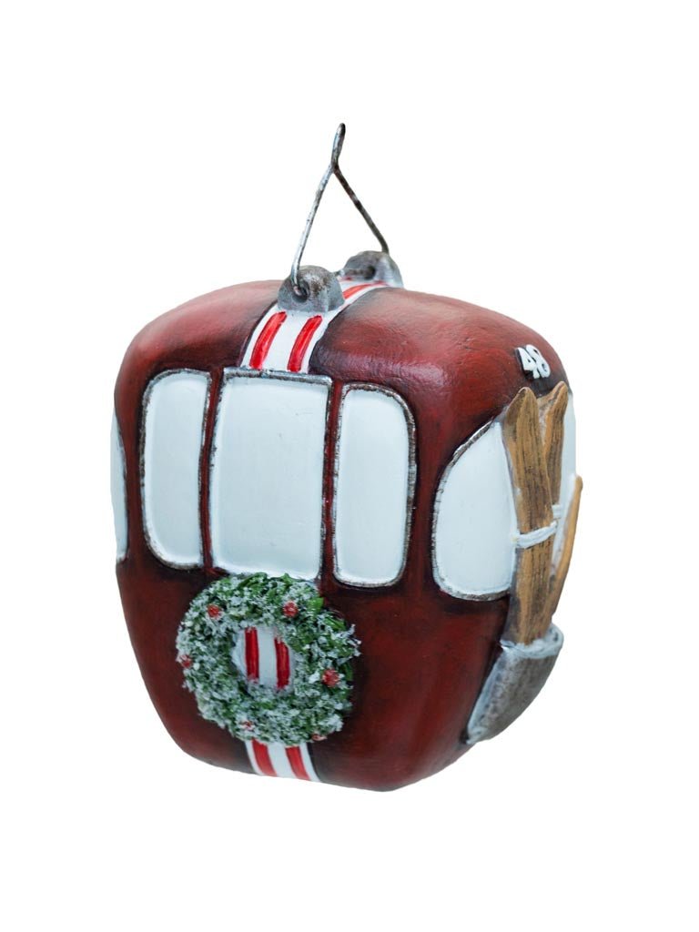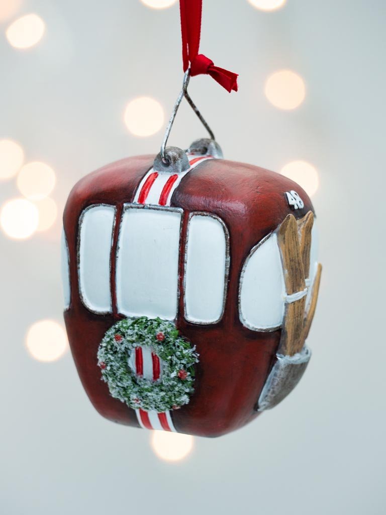 Precioso adorno navideño en forma de teleférico fabricado en resina en color rojo.