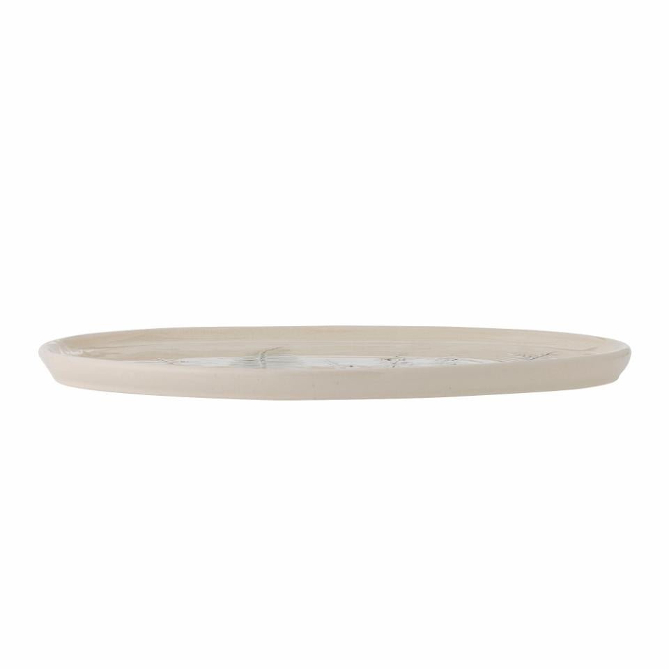 Precioso plato de servir fabricado en gres en tonos neutros. El plato presenta un motivo floral delicadamente decorado a mano impreso en su esmalte craquelado. Los detalles pintados a mano hacen que cada producto sea único, añadiendo un toque personal a la mesa. Apto para lavavajillas.