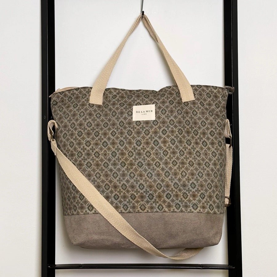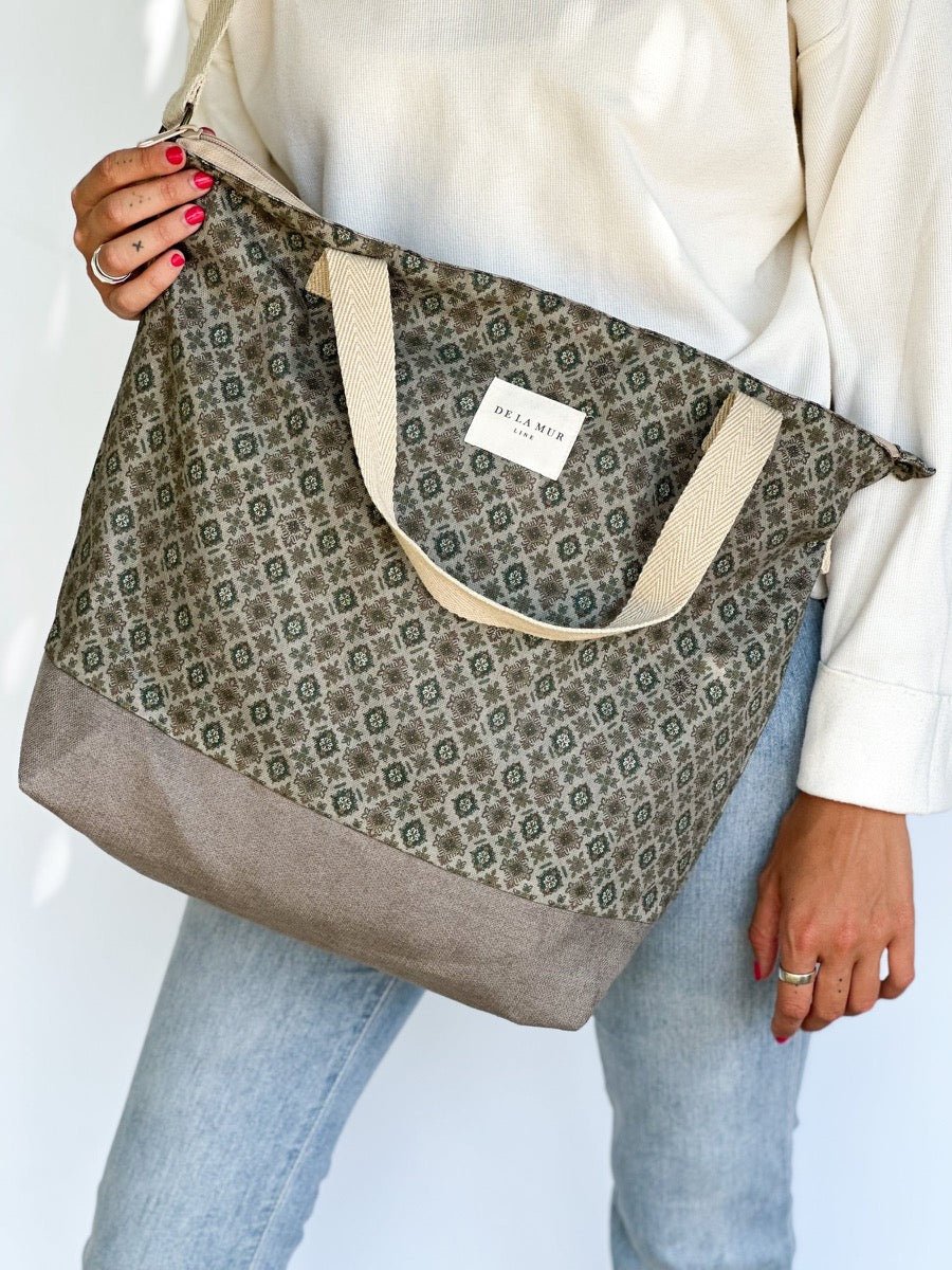 Bolso grande con asa larga ajustable y dos asas medianas en la parte superior de cinta de espiga de algodón de color beige. Combinado con dos tejidos diferentes, un tejido fino con estampado geométrico verde caqui en la parte superior y un tejido grueso liso marrón en la parte inferior. Cierre superior con cremallera. Forrado de tejido grueso de color gris en la parte interior. Bolsillo interior con cremallera. Opción de llevarlo al hombro o como bandolera. Para su correcto mantenimiento se aconseja lavarlo en frío a mano y no utilizar secadora.