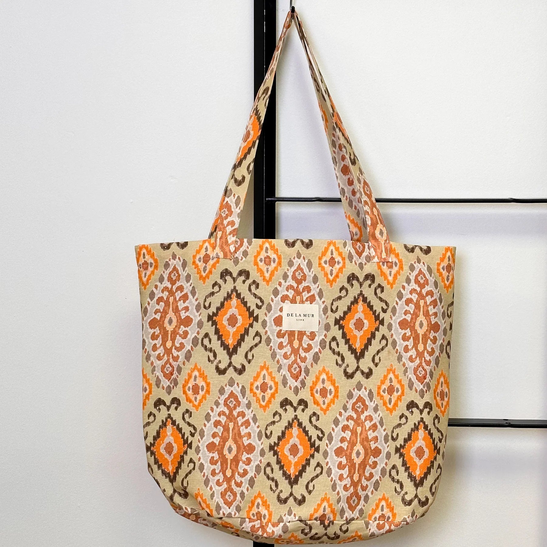 Bolsa shopper grande con asas para llevar al hombro. Con un tejido estampado geométrico en tonos anaranjados. Para su correcto mantenimiento se aconseja lavarlo en frío a mano y no utilizar secadora.