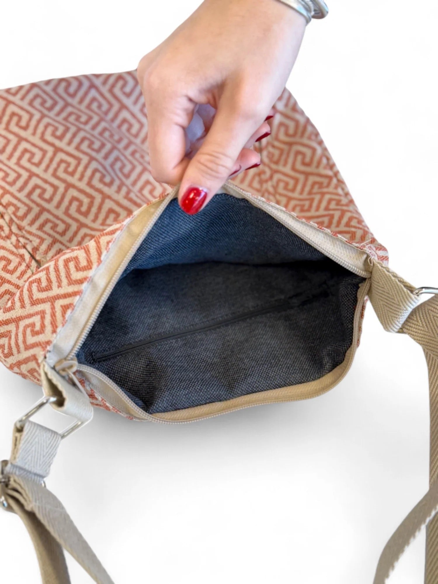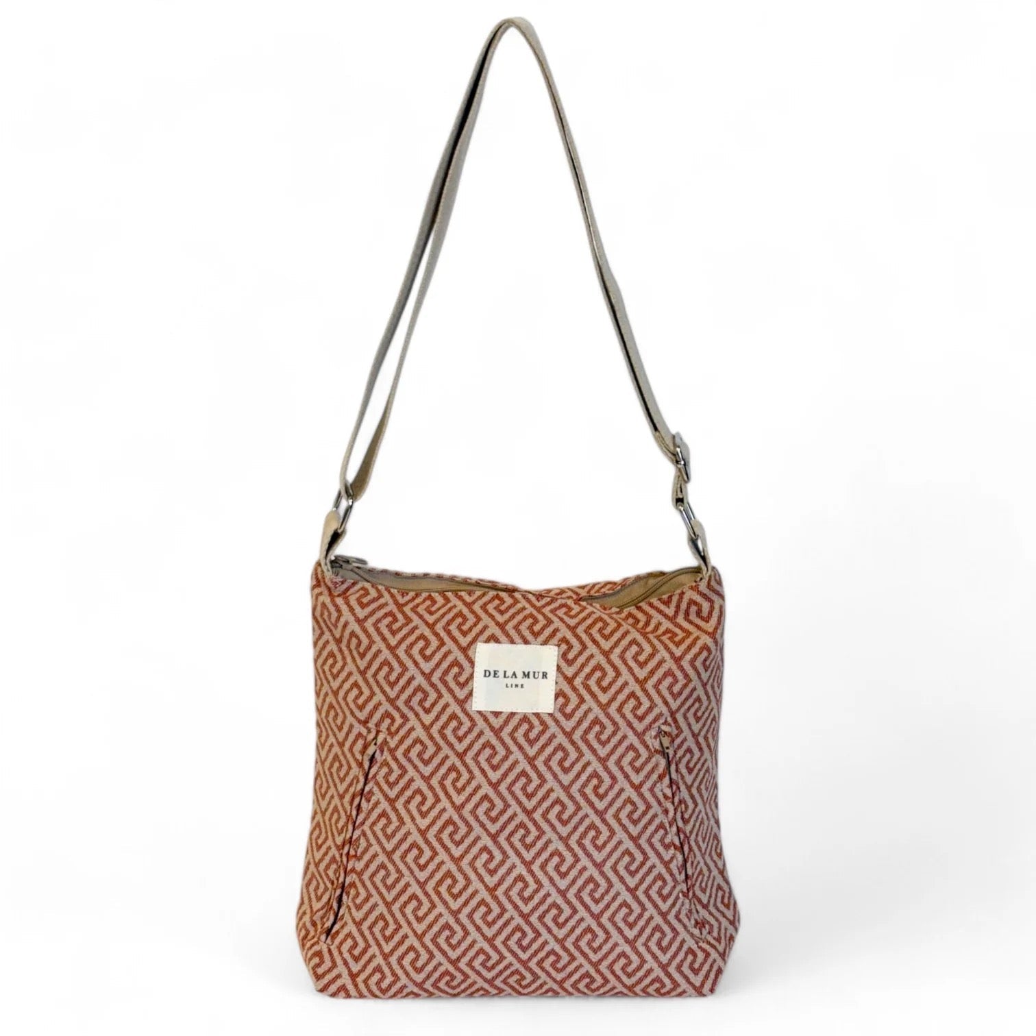 Bolso mediano tipo bandolera con asa larga ajustable de cinta de espiga de algodón de color beige. Con un tejido grueso de jacquard con estampado geométrico en tono teja. Cierre superior con cremallera. Dos bolsillos en la parte frontal con cremallera. Forrado de tejido grueso de color gris en la parte interior. Bolsillo interior con cremallera. Para su correcto mantenimiento se aconseja lavarlo en frío a mano y no utilizar secadora.