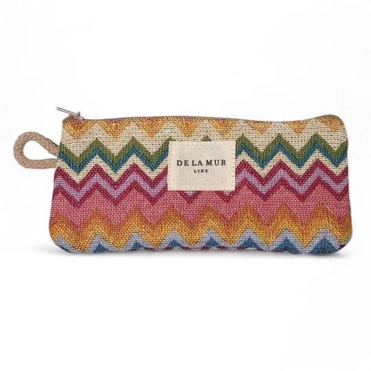 Funda de gafas con cremallera en la parte superior y pequeña asa de cordón de color marrón en el lateral. Con tejido grueso de jacquard con estampado zigzag en tonos rosados y azulados. Cada articulo puede tener una variación en el estampado, dependiendo de donde se haya efectuado el corte de la pieza. Forrado de tejido grueso de color gris en la parte interior. Para su correcto mantenimiento se aconseja lavarlo en frío a mano y no utilizar secadora.
