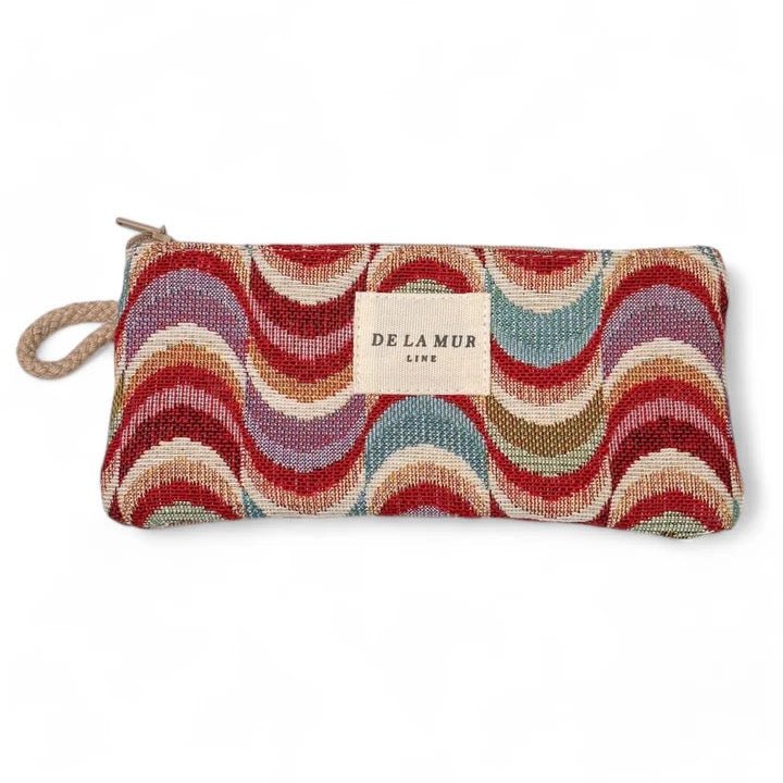 Funda de gafas con cremallera en la parte superior y pequeña asa de cordón de color beige en el lateral. Con tejido grueso de jacquard con estampado geométrico multicolor. Cada articulo puede tener una variación en el estampado, dependiendo de donde se haya efectuado el corte de la pieza. Forrado de tejido grueso de color gris en la parte interior. Para su correcto mantenimiento se aconseja lavarlo en frío a mano y no utilizar secadora.