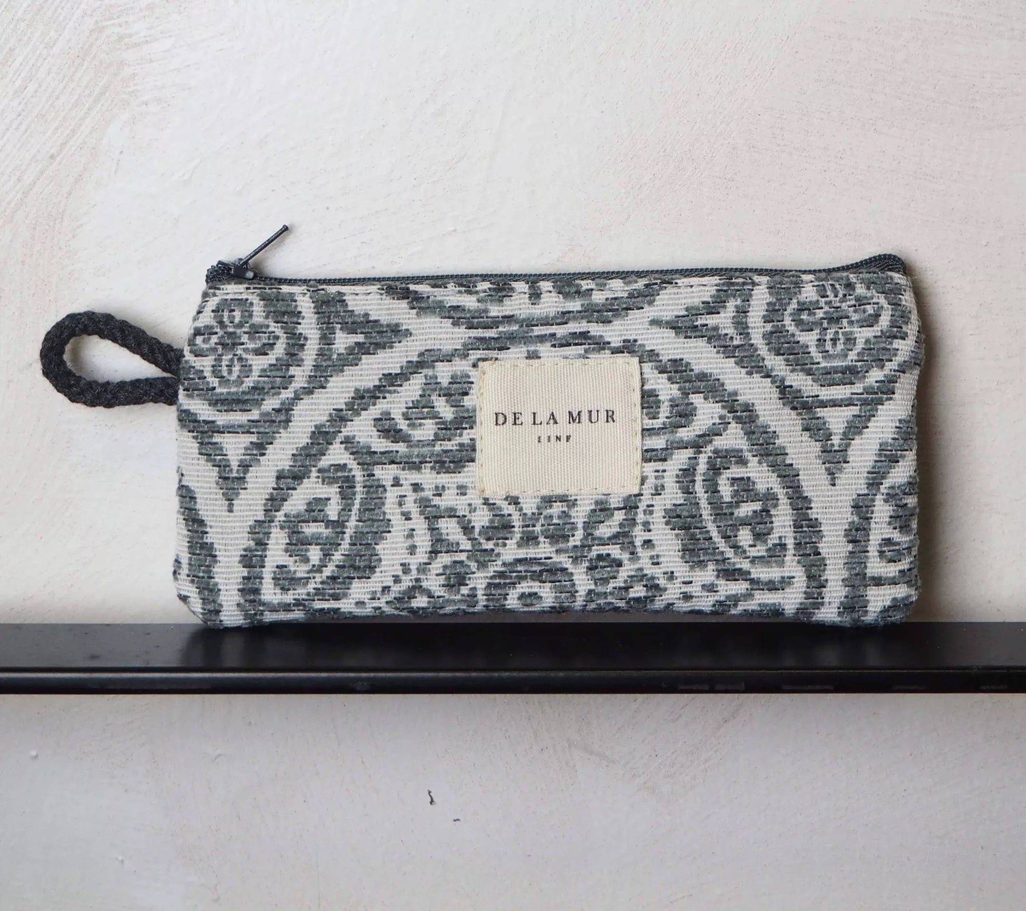 Funda de gafas con cremallera en la parte superior y pequeña asa de cordón de color gris en el lateral. Con tejido con estampado hidráulico en tono gris y crudo. Para su correcto mantenimiento se aconseja lavarlo en frío y no utilizar secadora.