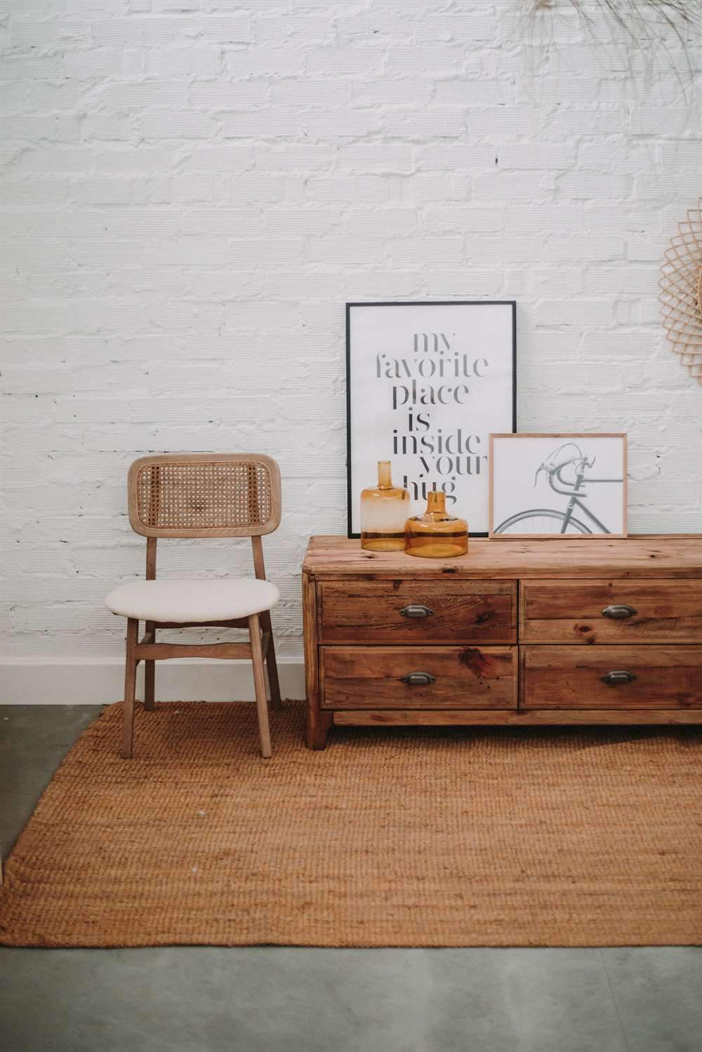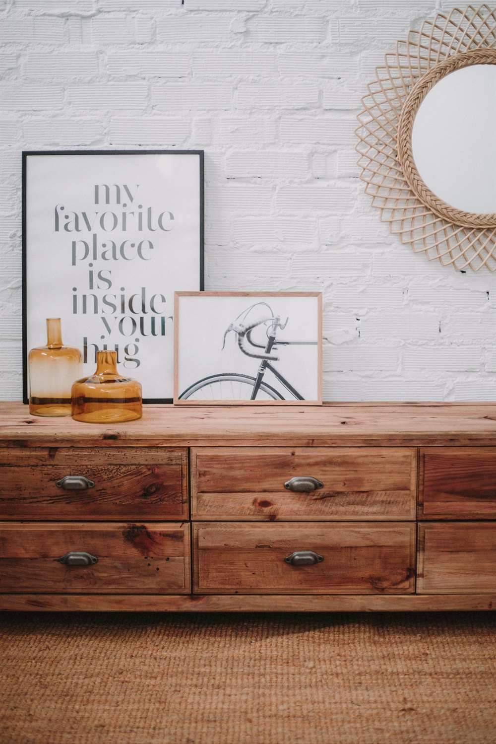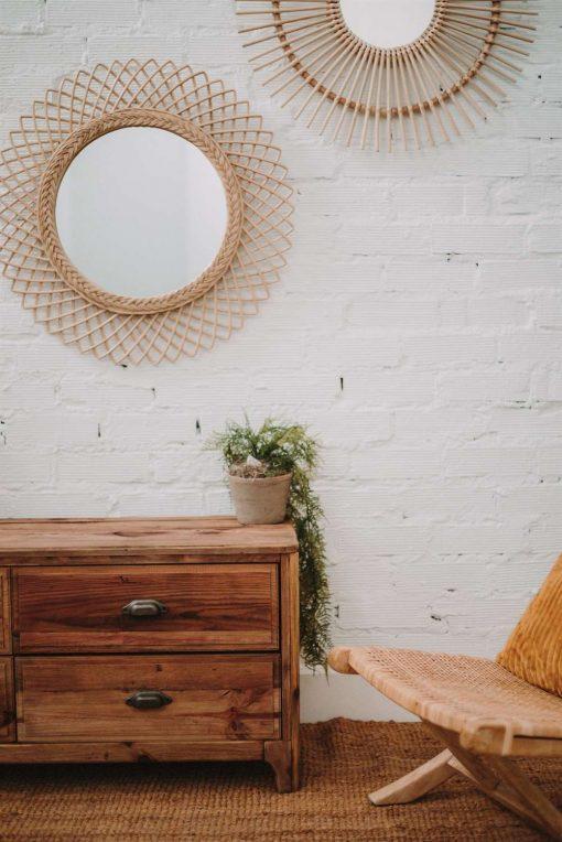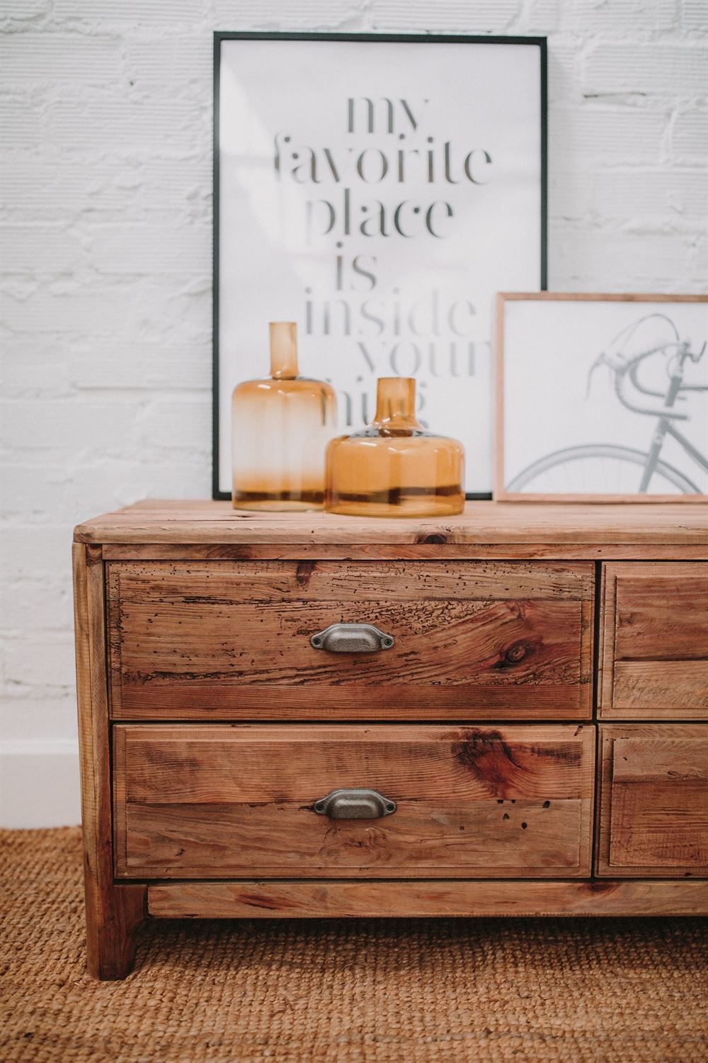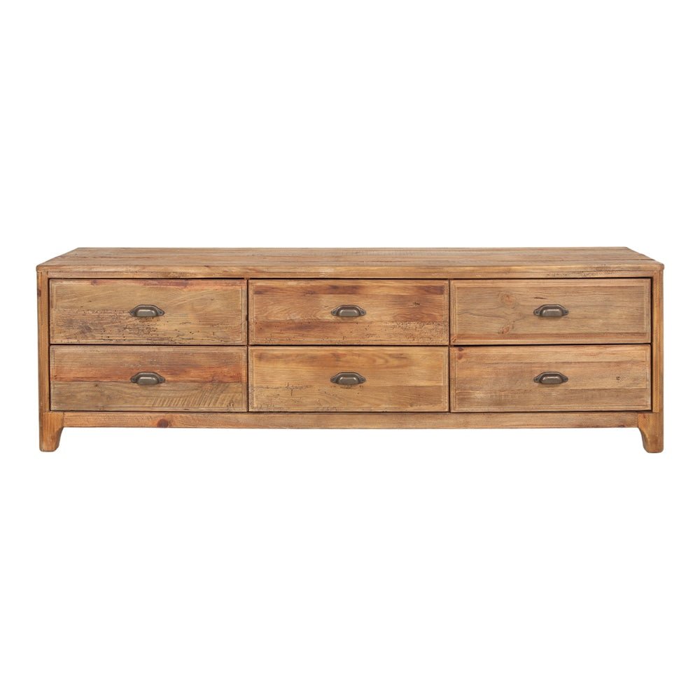 Mueble para TV fabricado en madera de pino reciclado en color natural. Cuenta con  seis cajones con tiradores. No requiere montaje.